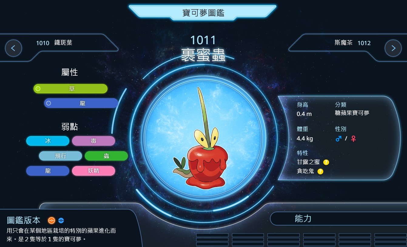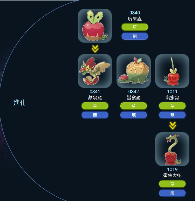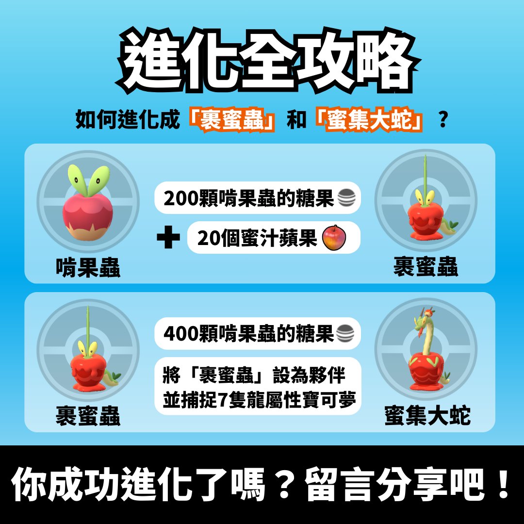^ 訓練家可以將「裹蜜蟲」設為夥伴並捕捉7隻龍屬性寶可夢後,使用400顆啃果蟲的糖果將「裹蜜蟲」進化成「蜜集大蛇」。