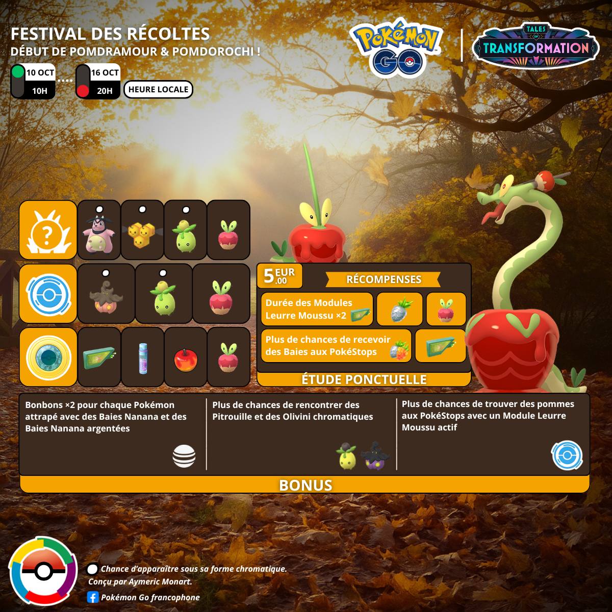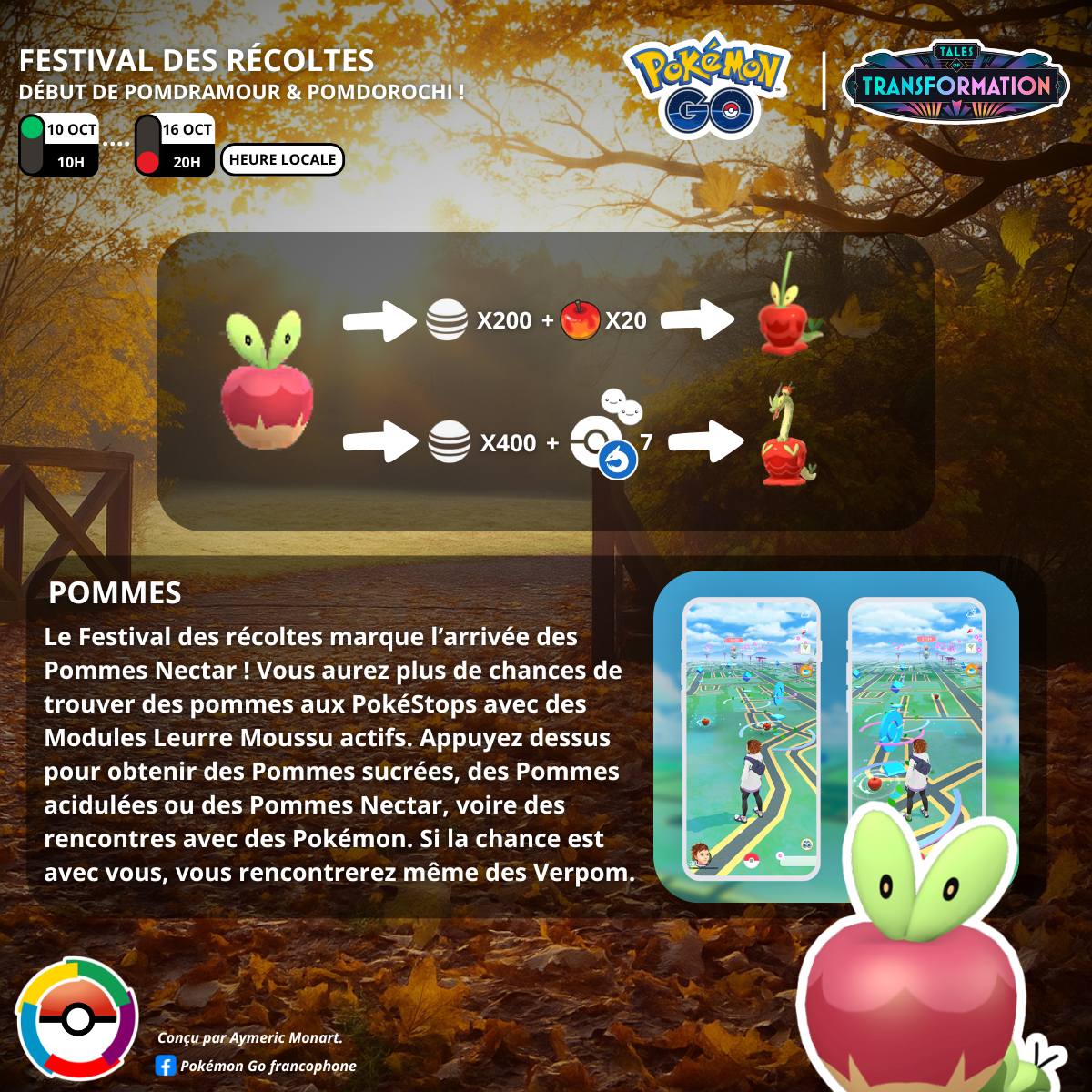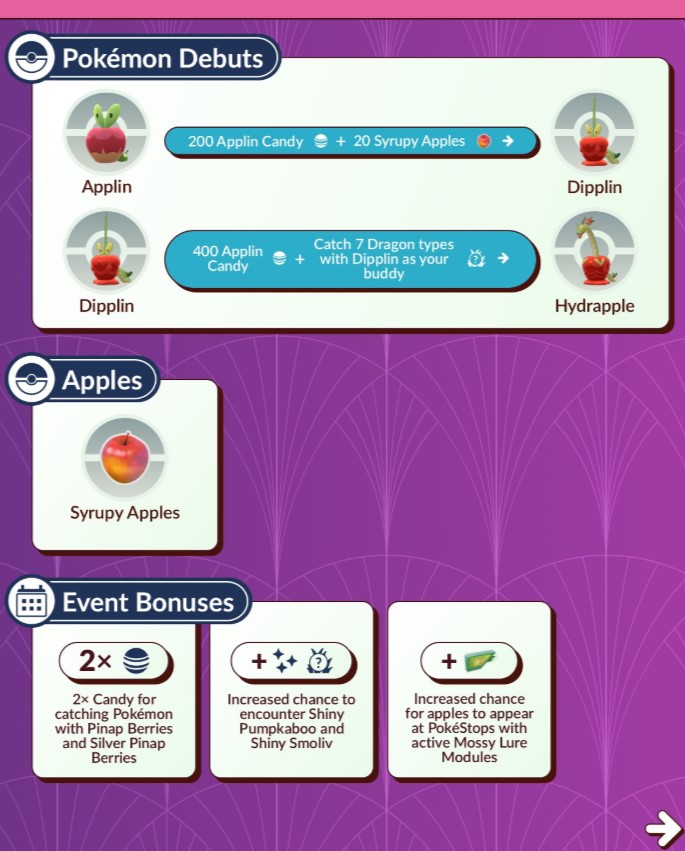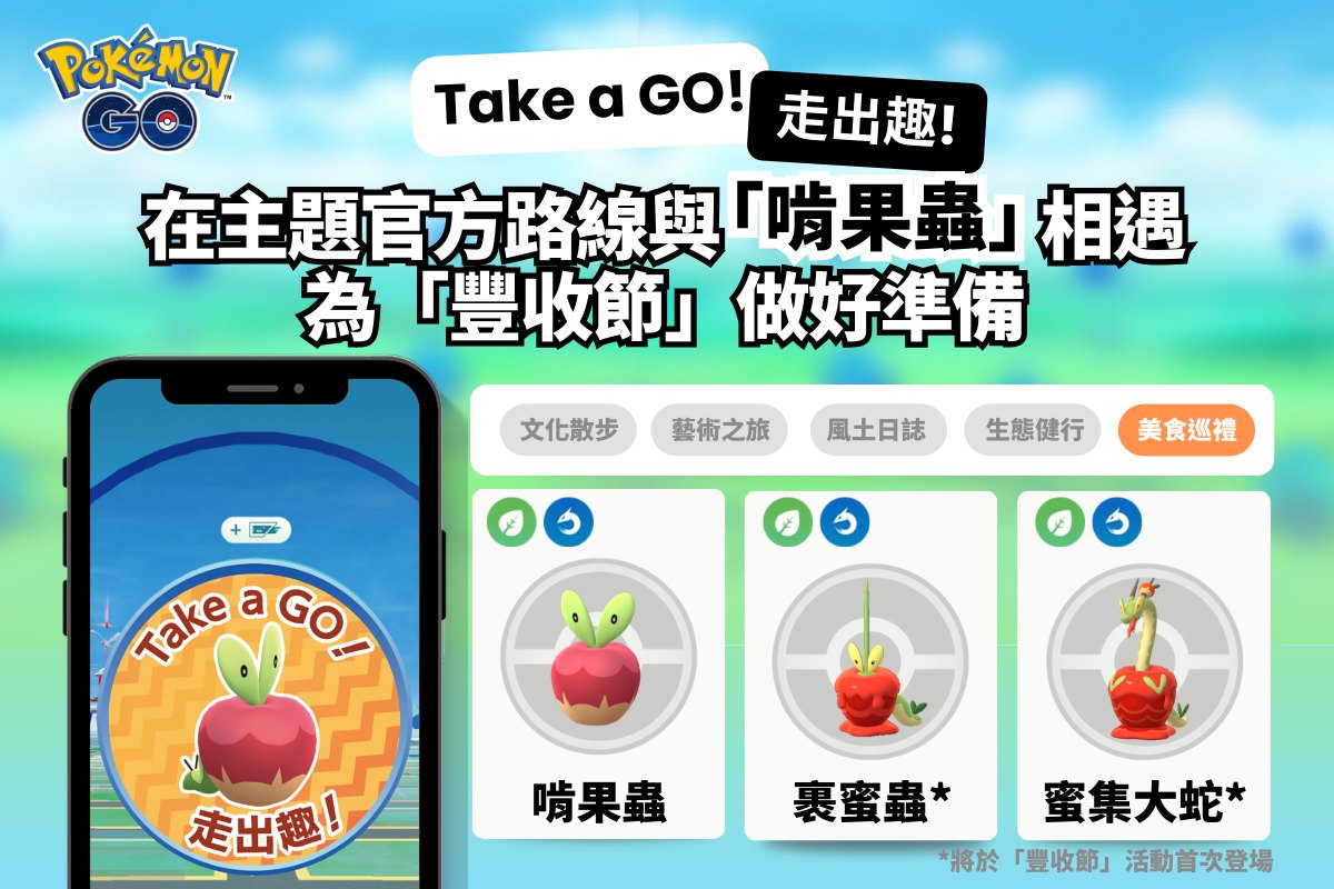訓練家在「豐收節」活動期間可以發現「蜜汁蘋果」!在啟用藥草誘餌模組的寶可補給站,蘋果出現的機率會提高,只要點擊蘋果,就能獲得甜甜蘋果、酸酸蘋果、蜜汁蘋果或是遇見寶可夢的機會——運氣好的話,還有機會遇見「啃果蟲」喔!