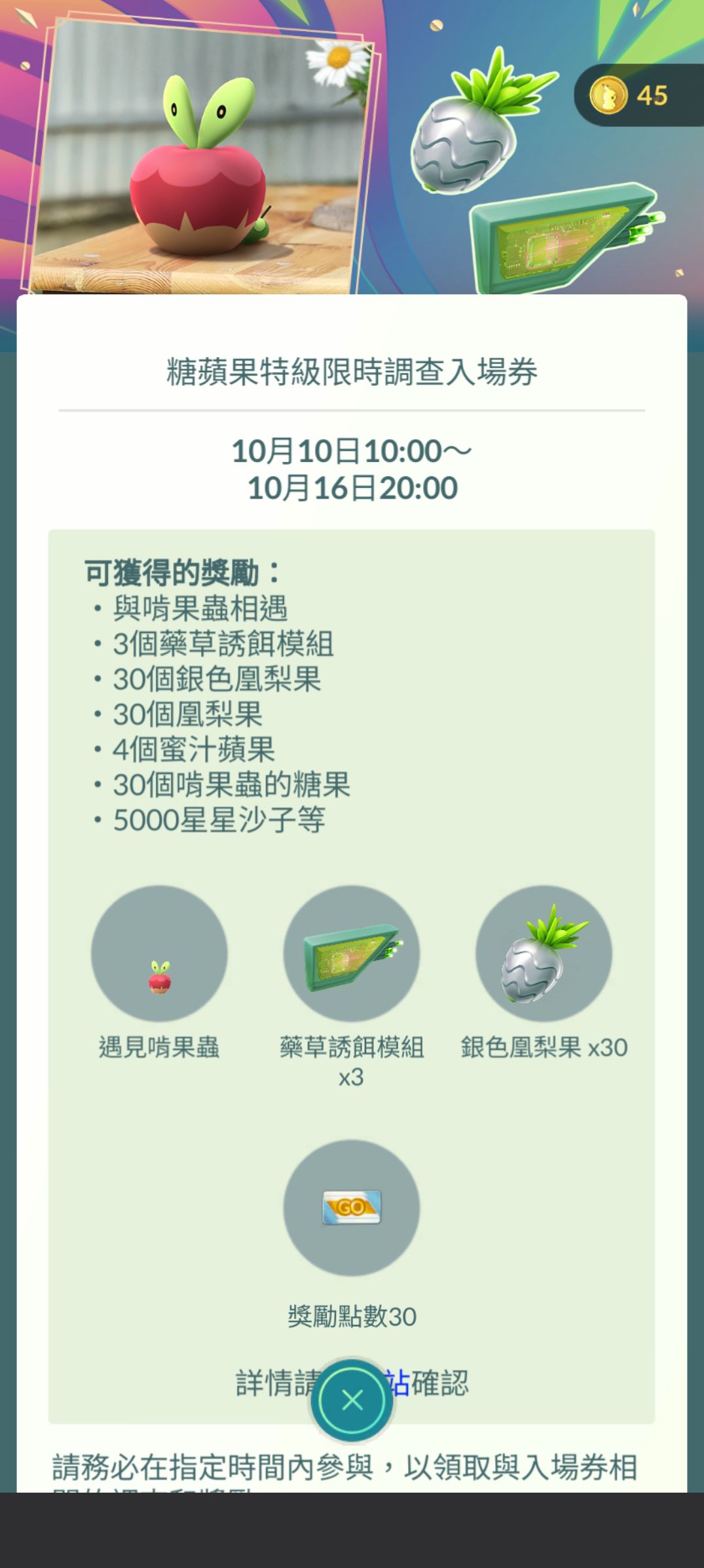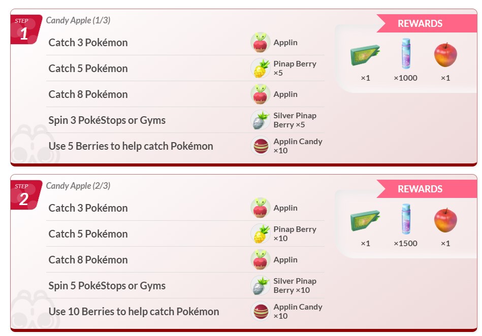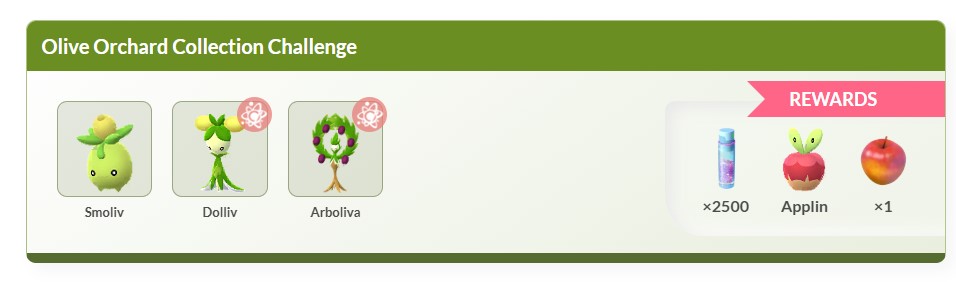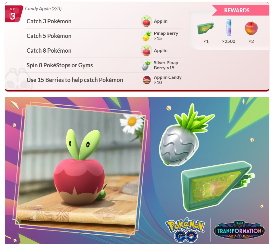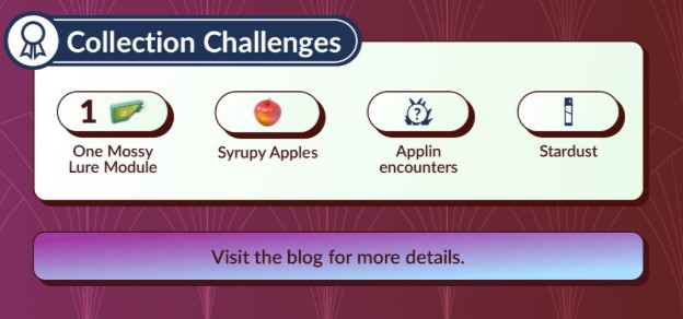 完成本次以「捕捉寶可夢」與「讓寶可夢進化」為主題的收藏家挑戰,即可獲得1個藥草誘餌模組、星星沙子、蜜汁蘋果以及與「啃果蟲」相遇的機會!