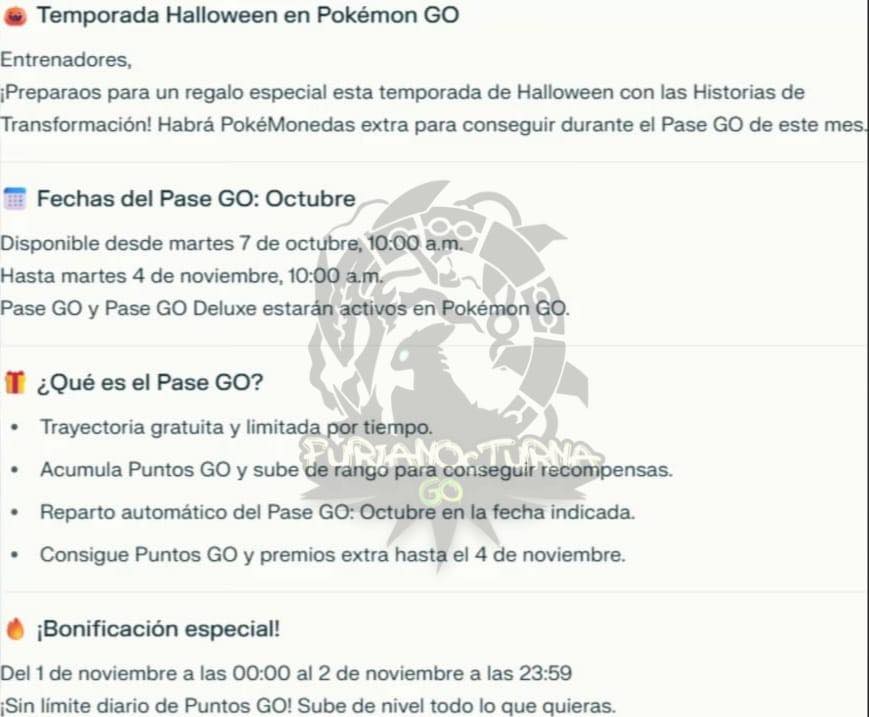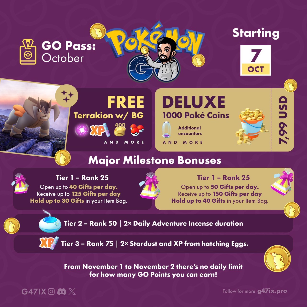 訓練家會在台灣時間10月7日10:00起獲得系統發放的免費「GO Pass:10月」,並且能夠在台灣時間11月4日10:00前累積「GO點數」,提升級別來獲取額外的獎勵內容。