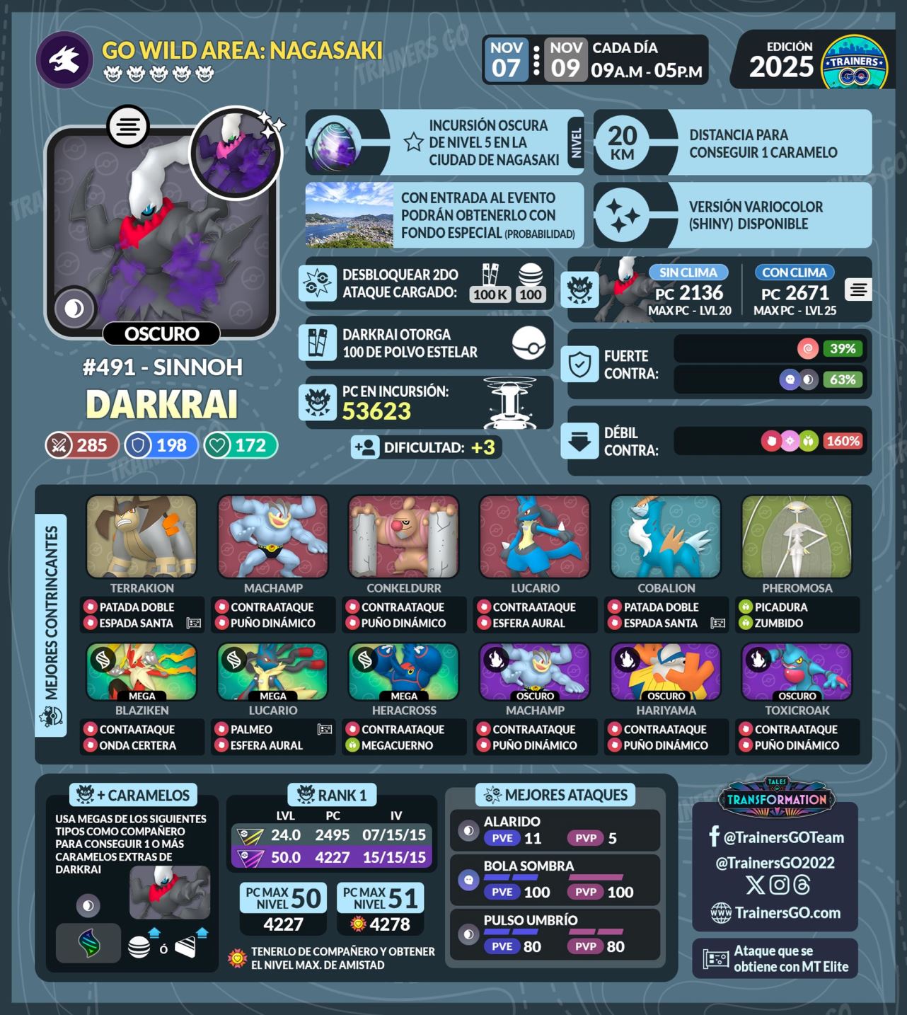 🤓 Trainers, están apareciendo Grimmsnarl Gigamax, Cresselia oscuro, Darkrai oscuro y Bewear con capa únicamente en la ciudad de Nagasaki, donde se llevará a cabo el evento Pokémon GO Wild Area en dicho lugar.