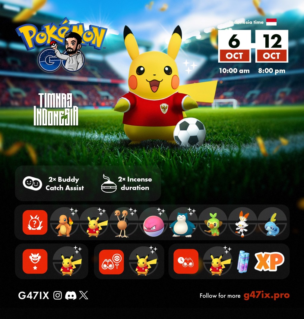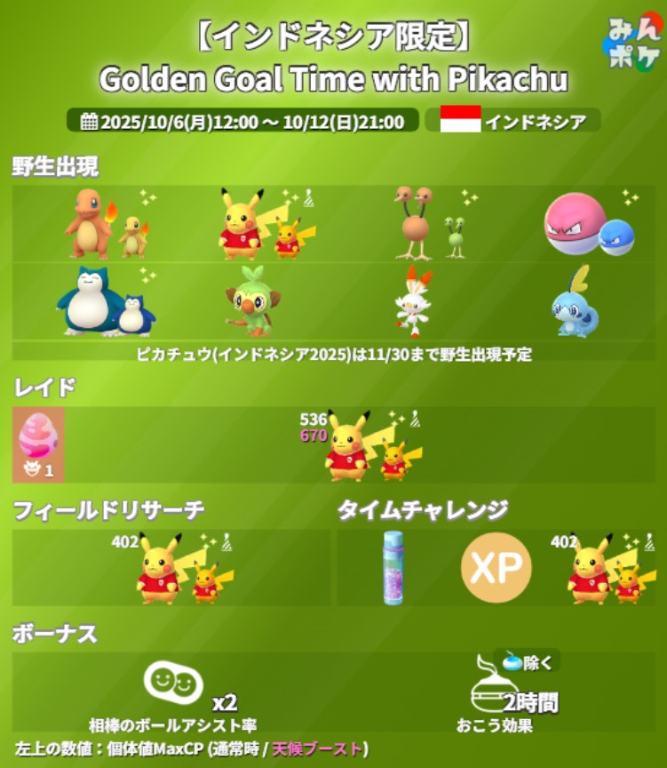 🥳Trainers, aquí les compartimos la información del evento local “Hora de Gol de Oro con Pikachu”, exclusivo de Indonesia en Pokémon GO.