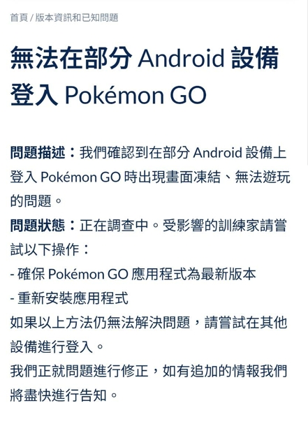 我們確認到在部分 Android 設備上登入 Pokémon GO 時出現畫面凍結、無法遊玩的問題。