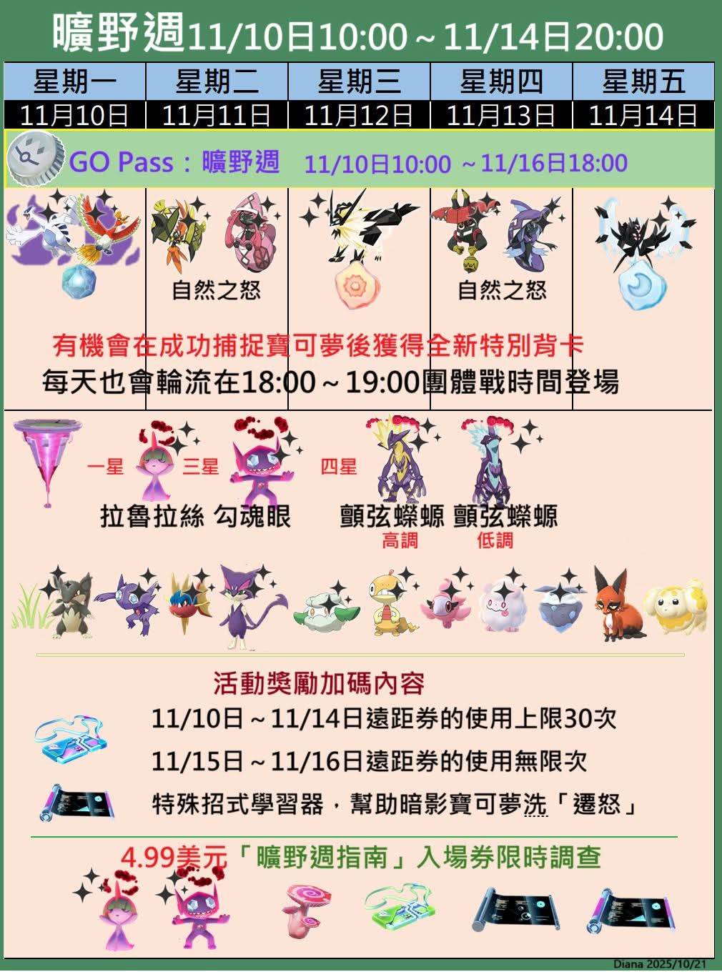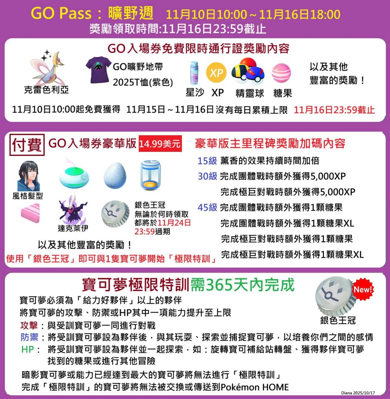 11/10曠野週、極巨對戰、暗影團體戰、銀色王冠極限特訓田野調查任務、Pokemon GO 2025