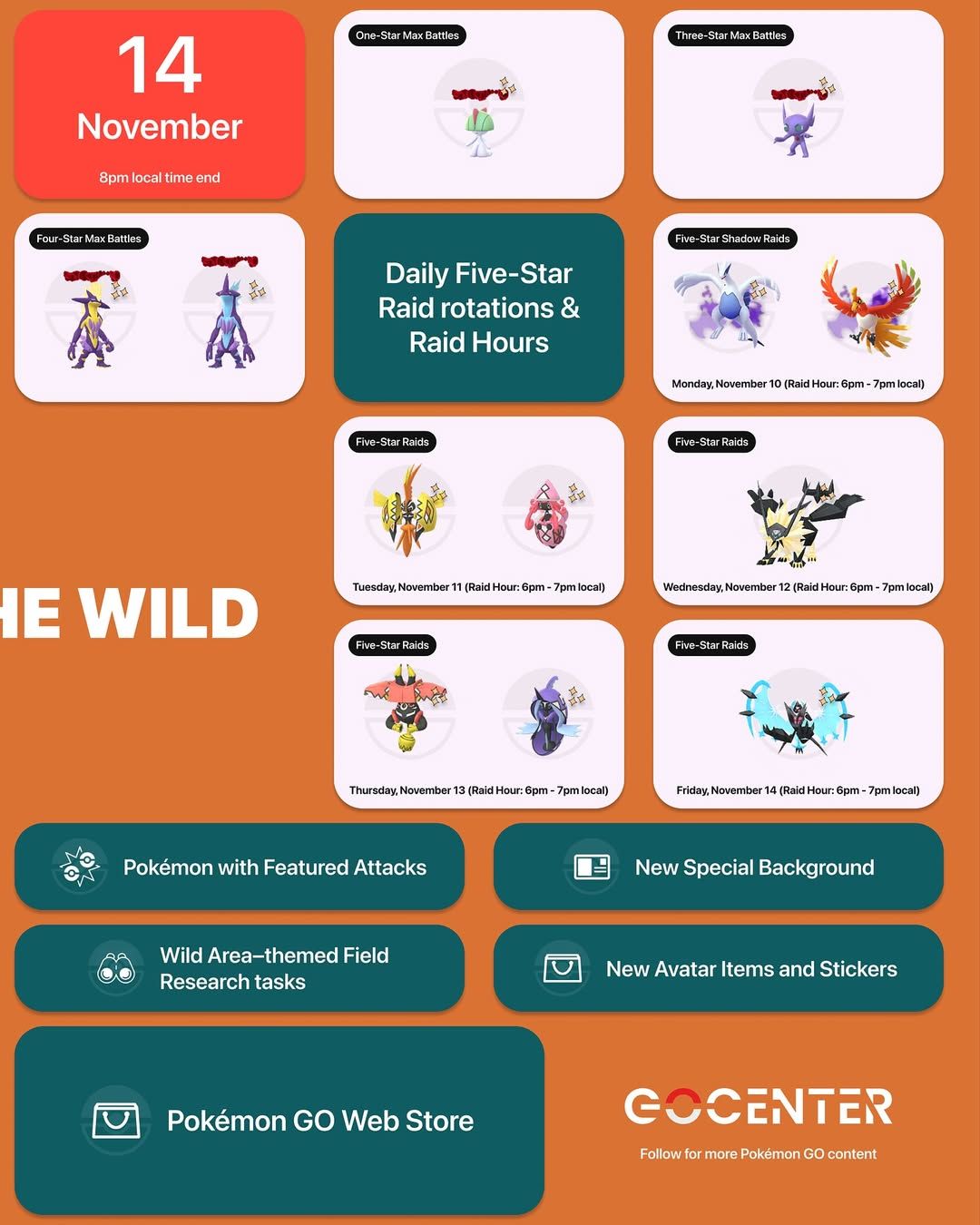 台灣時間2025年11月10日10:00~11月16日18:00期間,所有訓練家都能夠經由寶可補給站與友情禮物獲得「Pokémon GO曠野地帶」主題貼圖。訓練家也可以在2025年11月7日~11月16日期間,從遊戲內商店取得這些貼圖!