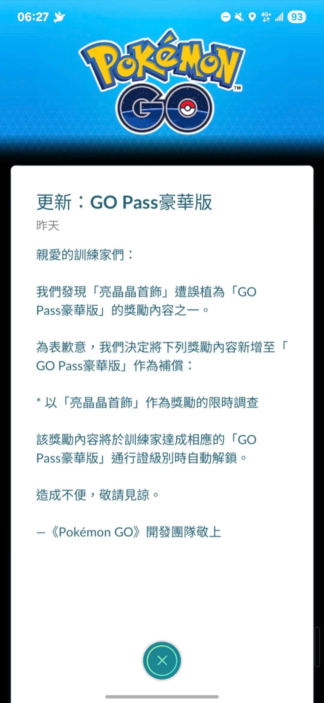 — 《Pokémon GO》開發團隊敬上 (下方有一個「X」的關閉按鈕)