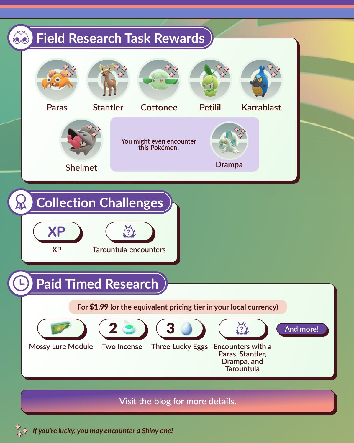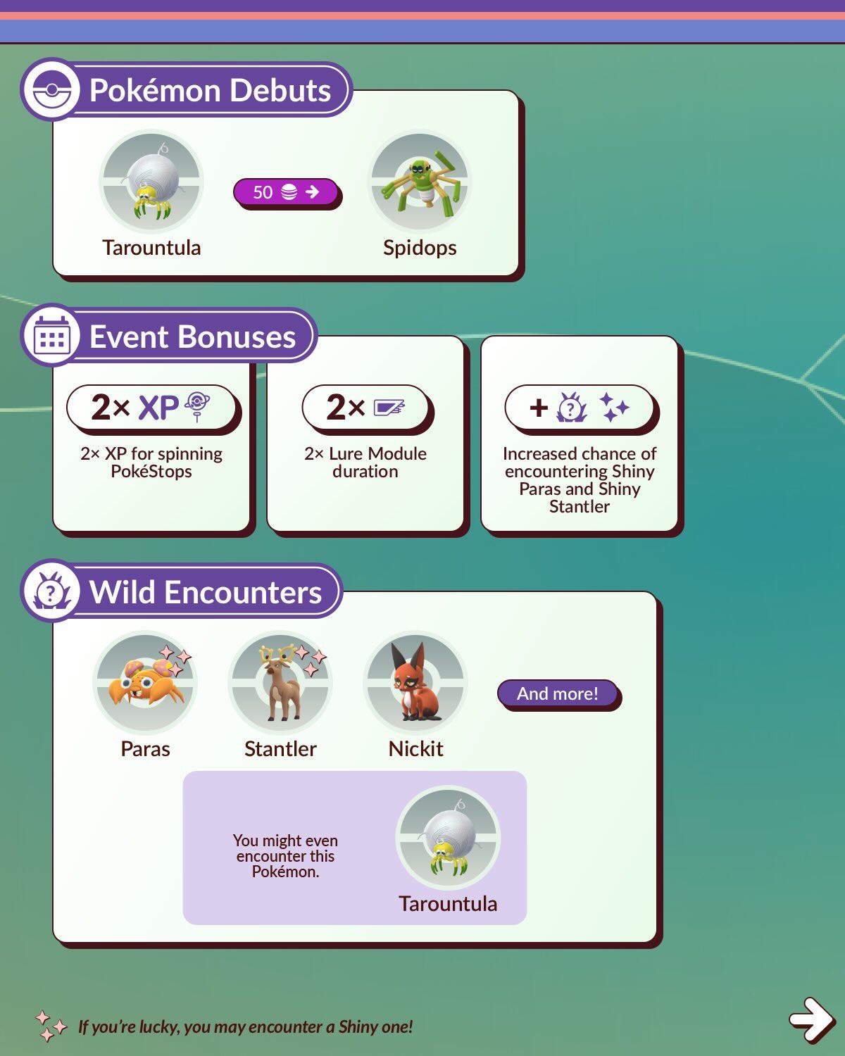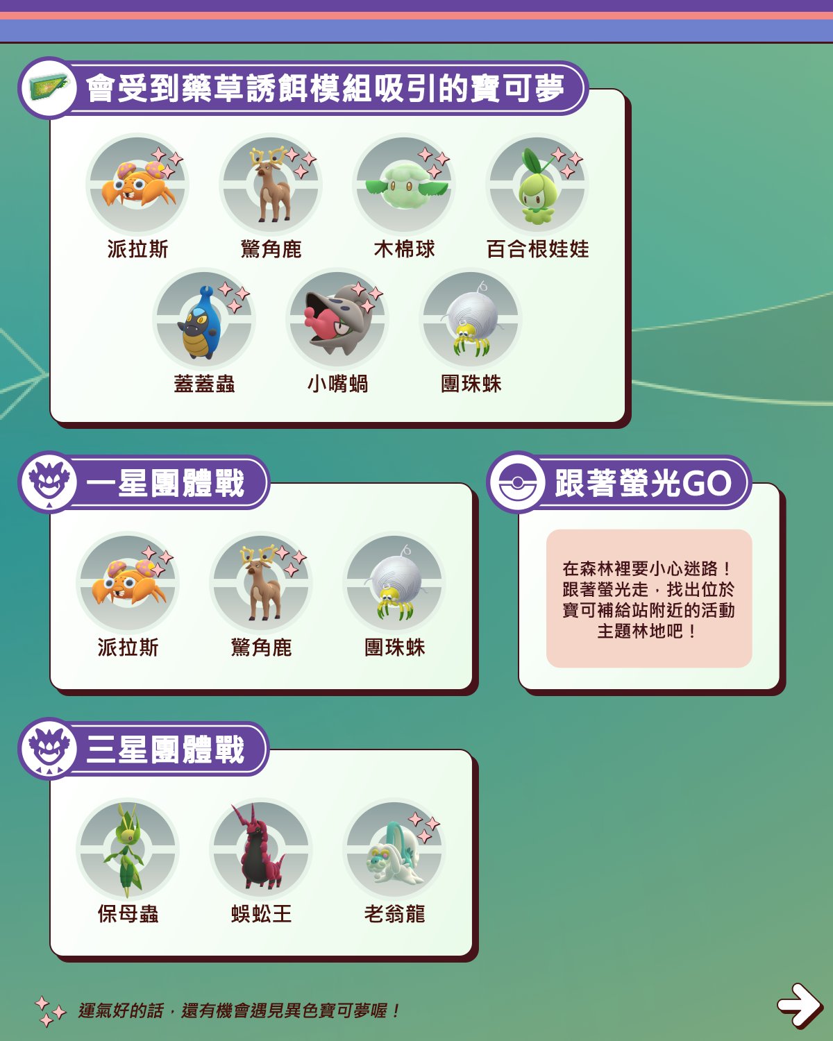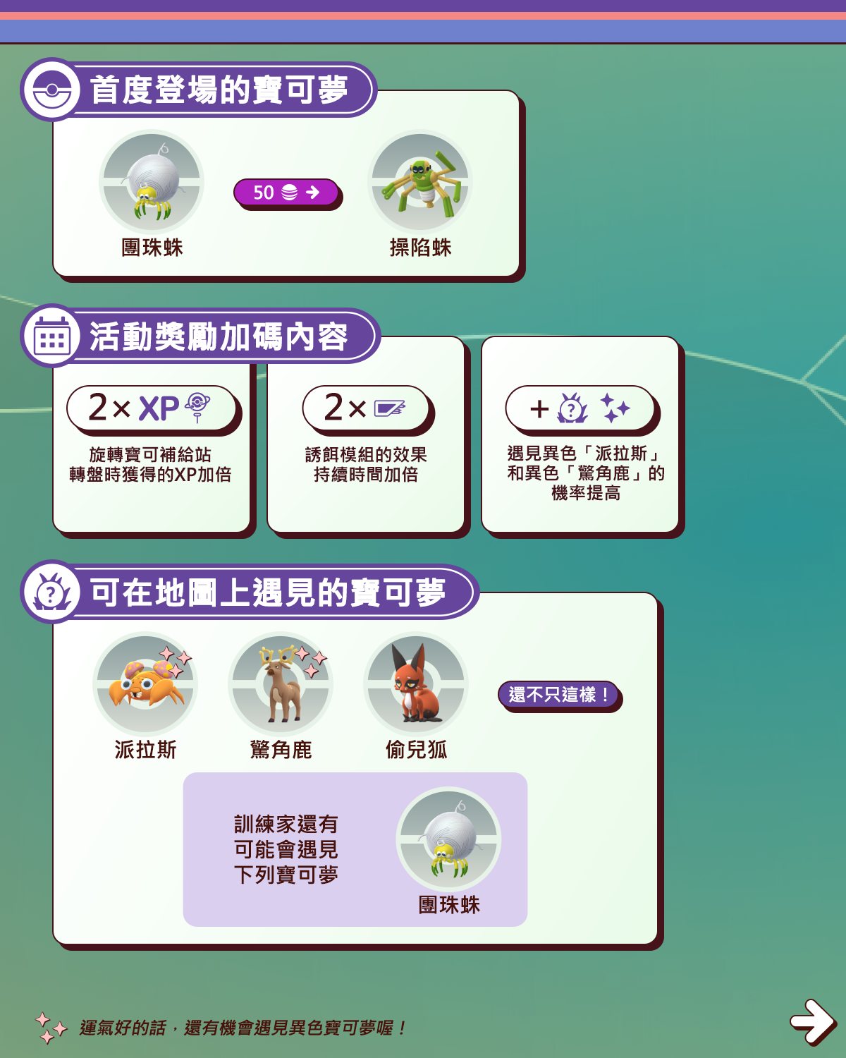 訓練家將有機會在地圖上遇見「派拉斯」 *、「驚角鹿」 *與「偷兒狐」等活動主題寶可夢!訓練家甚至還有機會遇見「團珠蛛」喔!