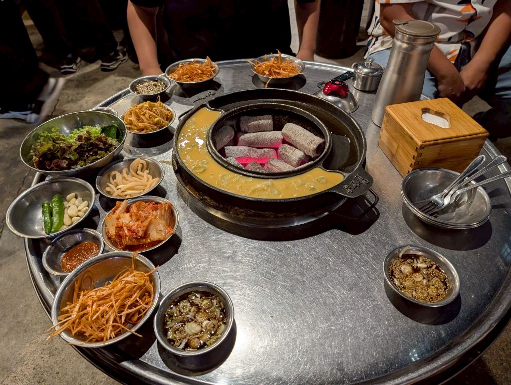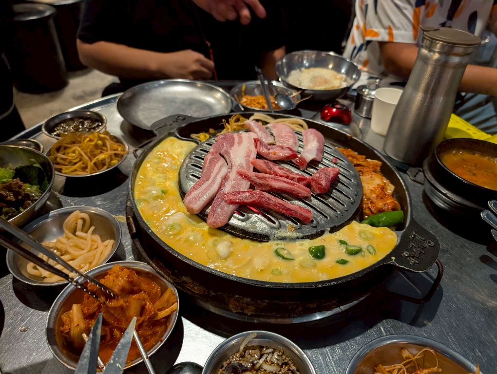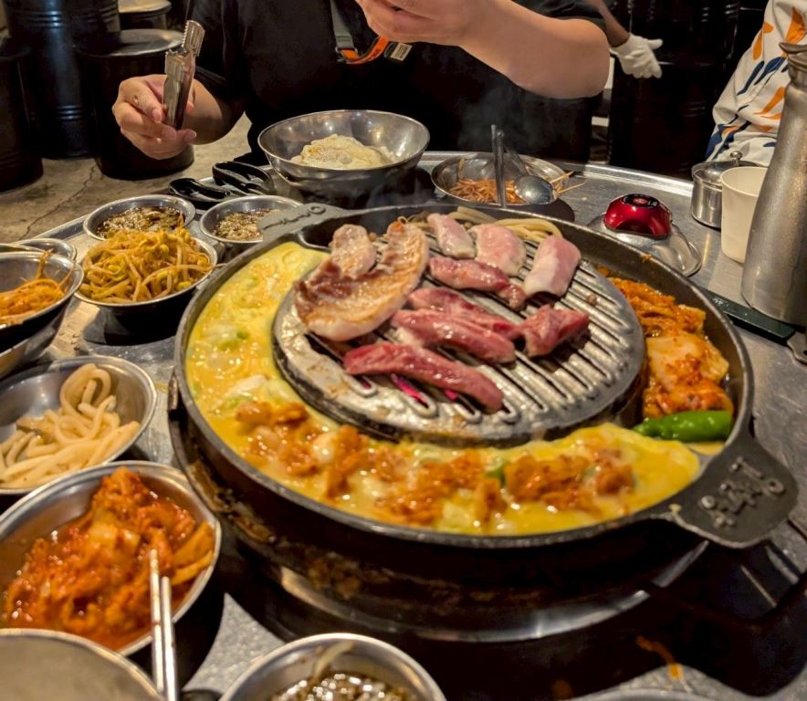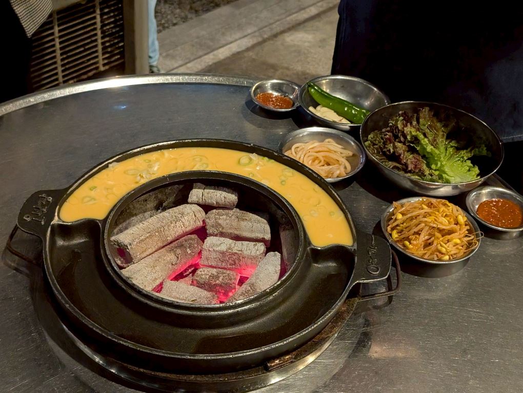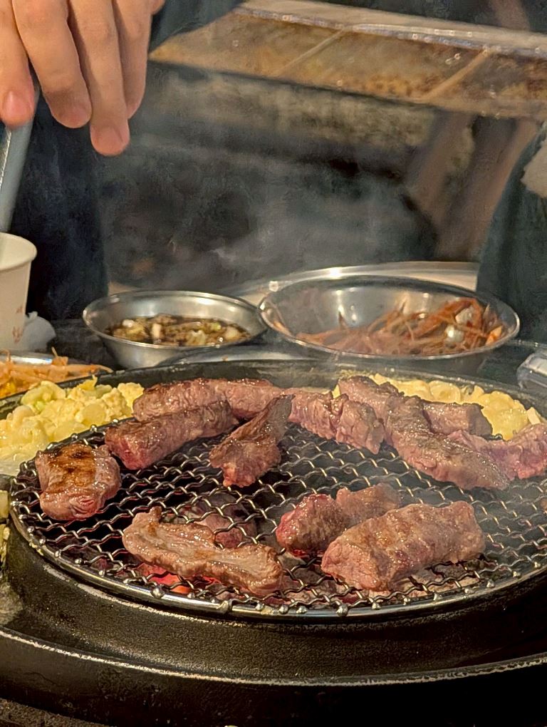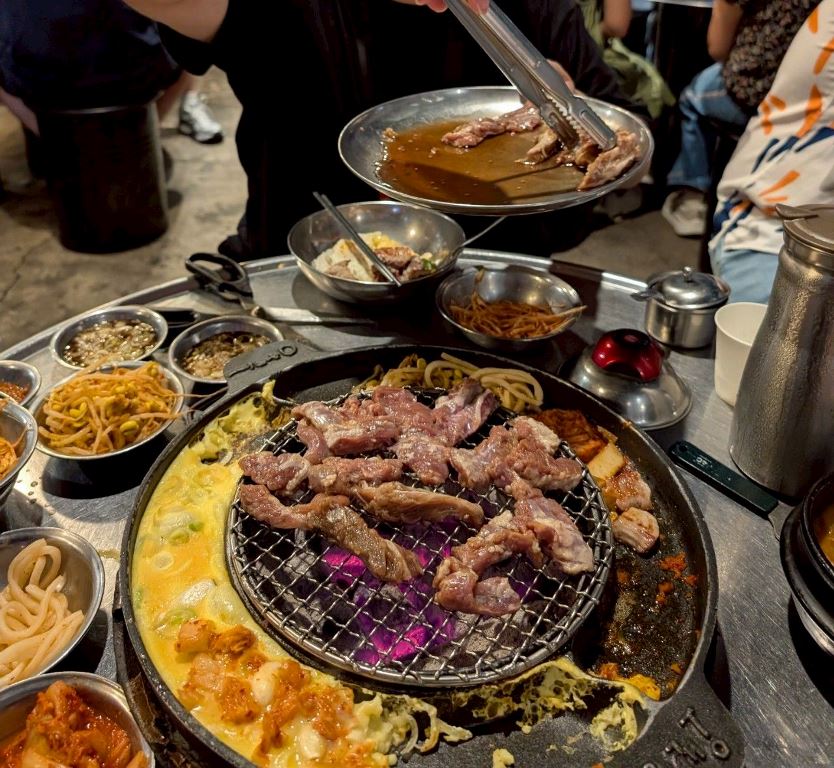 Special Grill: The restaurant is famous for its unique grill design. It features an outer ring or moat around the central grill. Staff will pour a seasoned egg mixture (Gyeran-jjim) into this ring, which cooks into a fluffy steamed egg as you grill your meat. This outer section is also perfect for grilling kimchi, bean sprouts, and garlic.