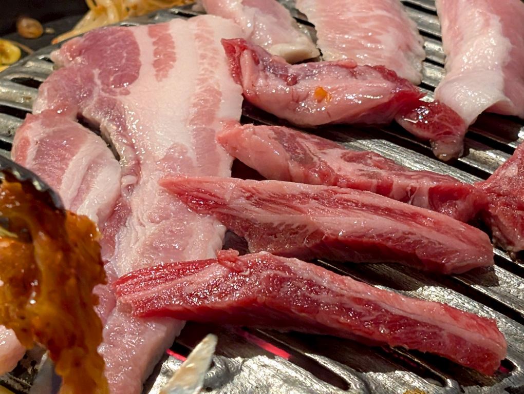 꽃갈비살 (牛五花排/霜降牛肋條): 如照片所示,這是高品質的牛肉選擇,油花分佈均勻,肉質鮮嫩。