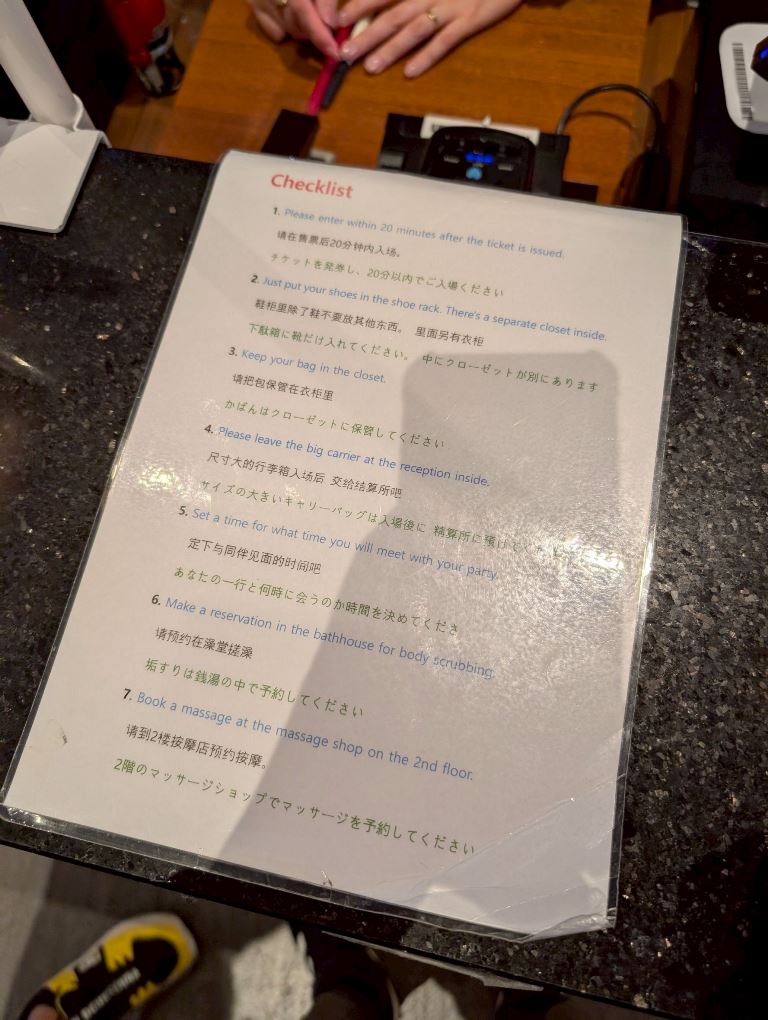 結帳 (Check-out): 櫃檯會讀取您的鑰匙,結清您在場內的所有額外消費(如餐飲、搓澡等)。