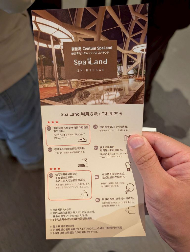 如何前往: 搭乘釜山地鐵2號線至「Centum City (센텀시티)」站,從 12 號出口出來,百貨公司入口就在旁邊,Spa Land 位於 1 樓(Gate 4 附近)。