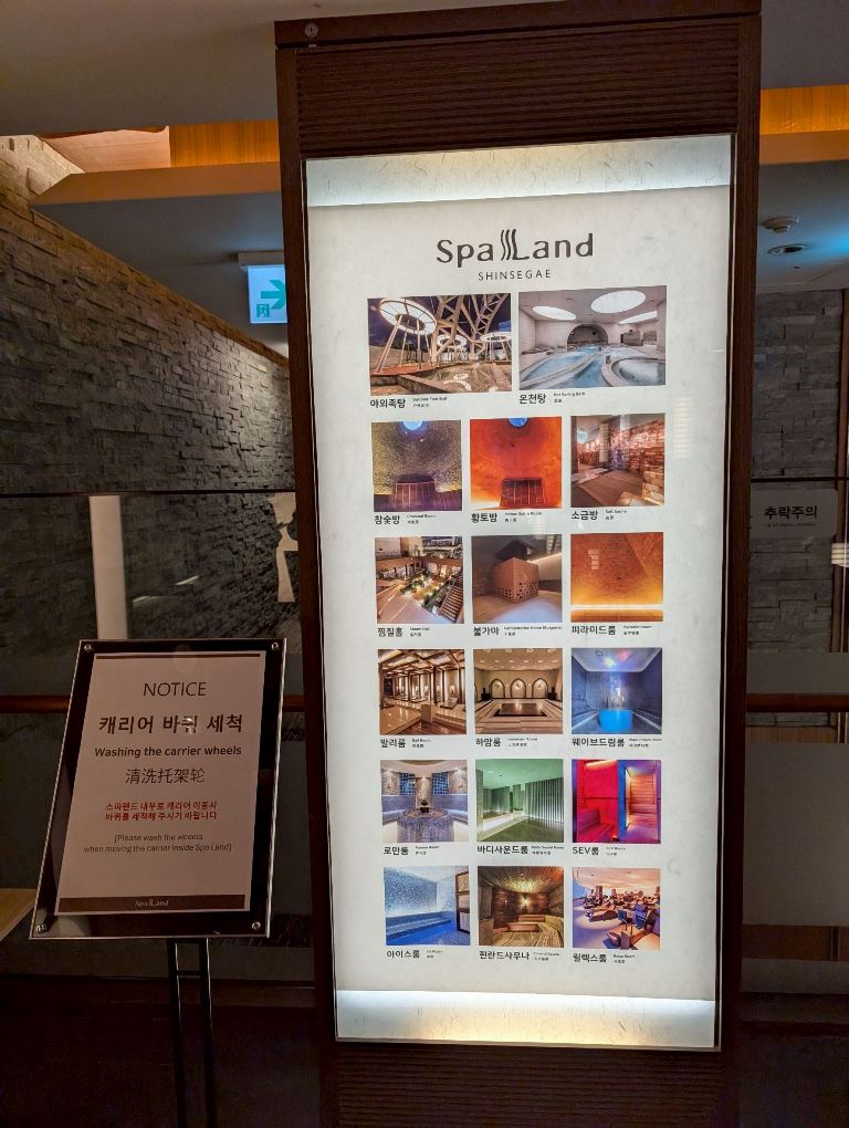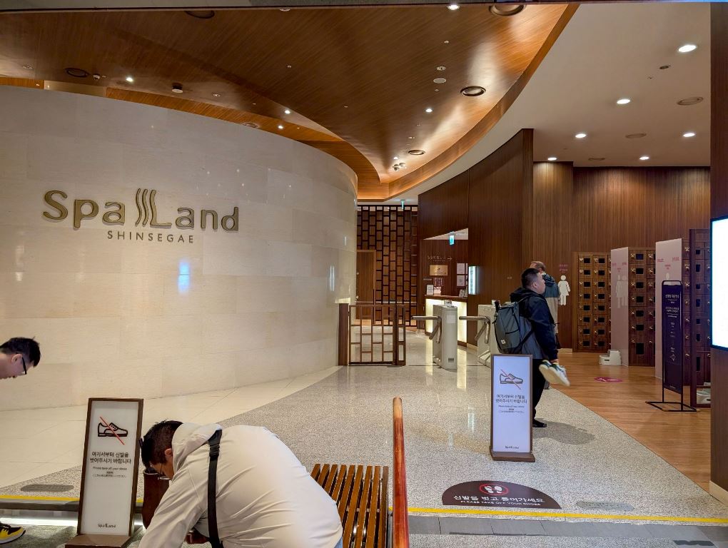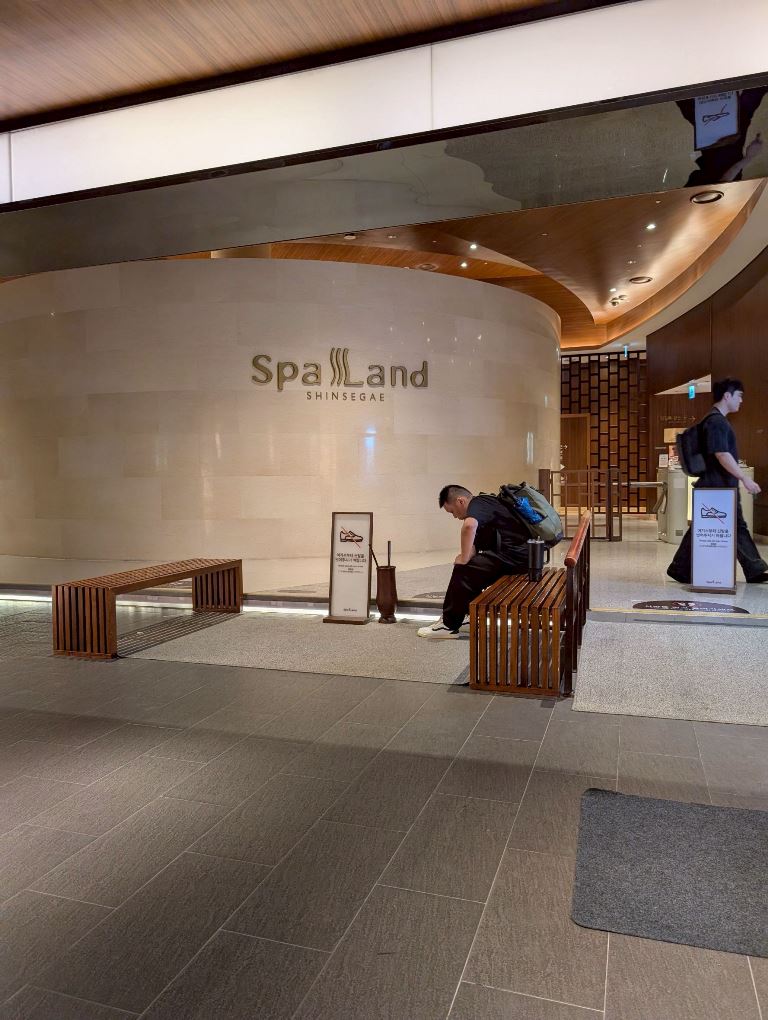招牌上清楚地寫著 Spa Land 以及 SHINSEGAE(新世界)。