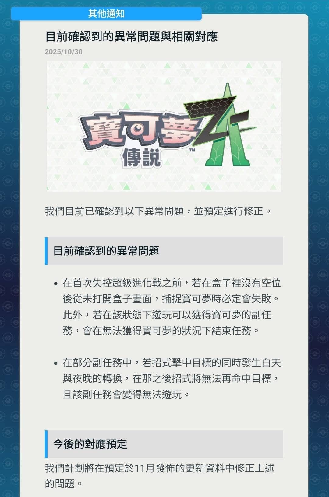 10/30 異常問題修正公告 @ 寶可夢傳說Z-A攻略 Pokemon Z-A