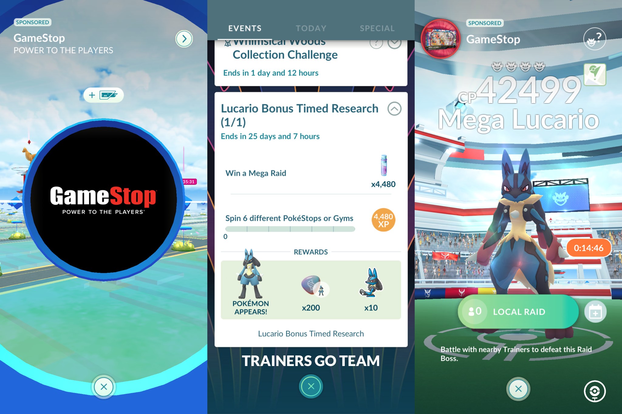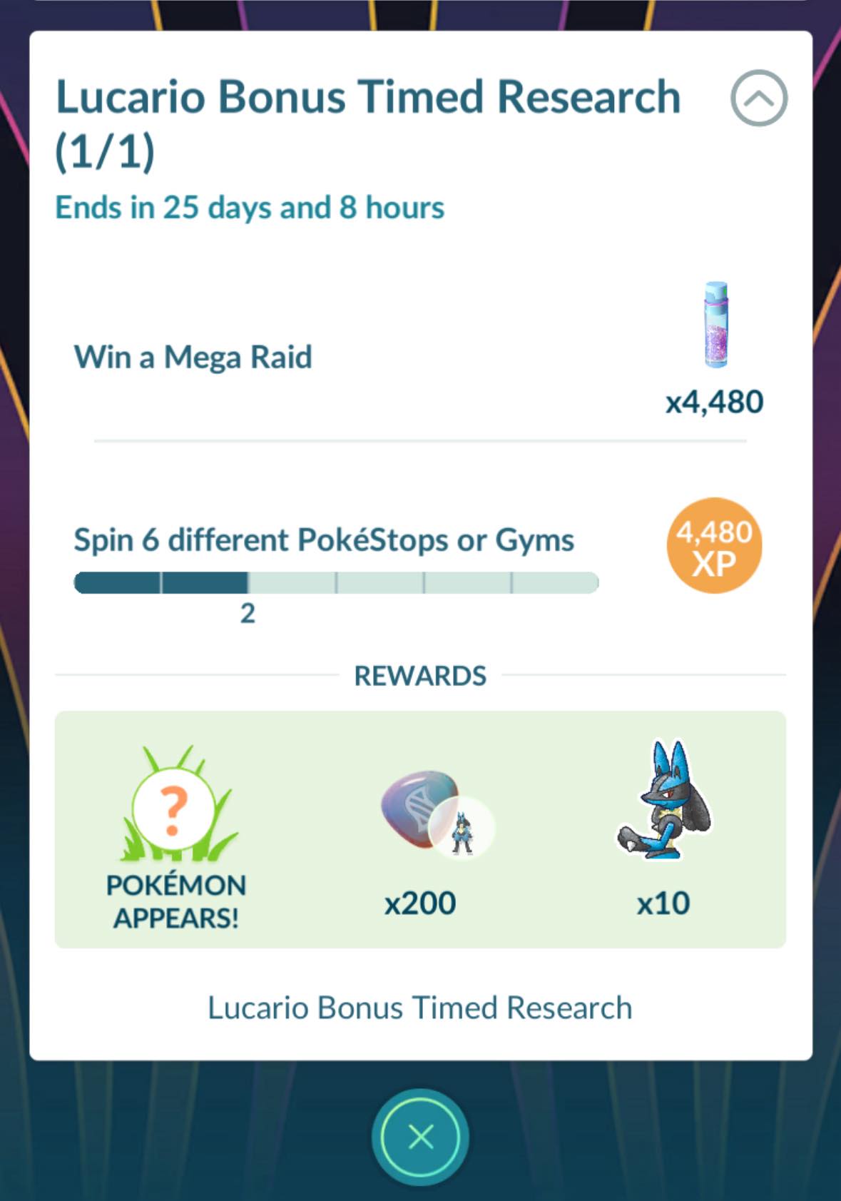 限時調查: 只要前往上述任一參與活動的零售商店並開啟 Pokémon GO 遊戲,就能獲得活動主題的限時調查。完成任務可獲得 XP、星塵 (Stardust) 以及一隻路卡利歐的遭遇獎勵。