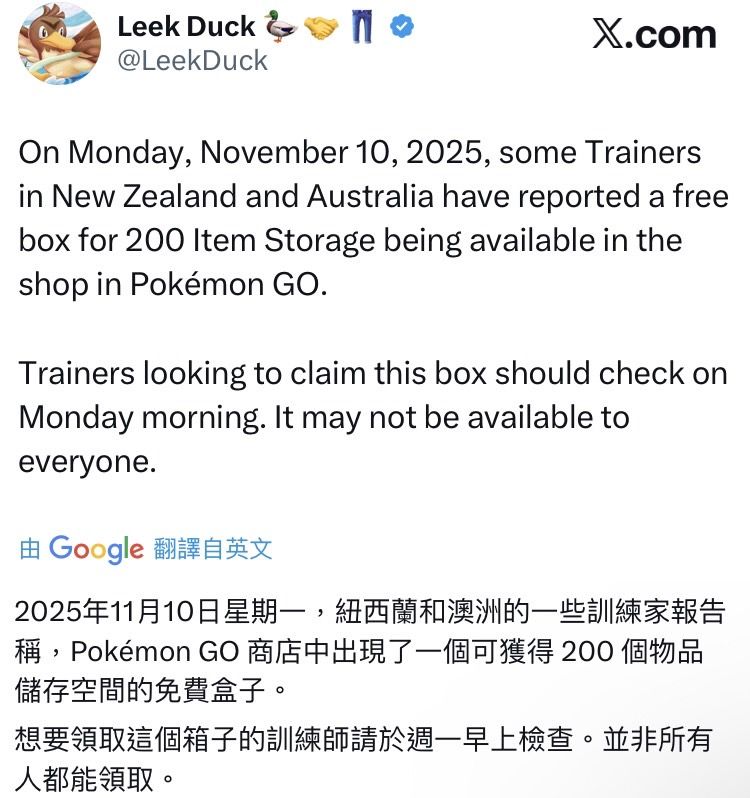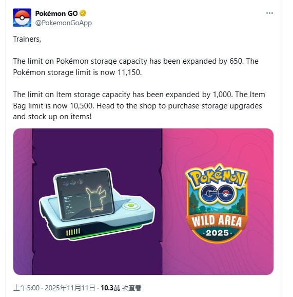 11/10 限時登入【免費領取獎勵禮盒】升級道具包包*4 Pokemon GO 2025