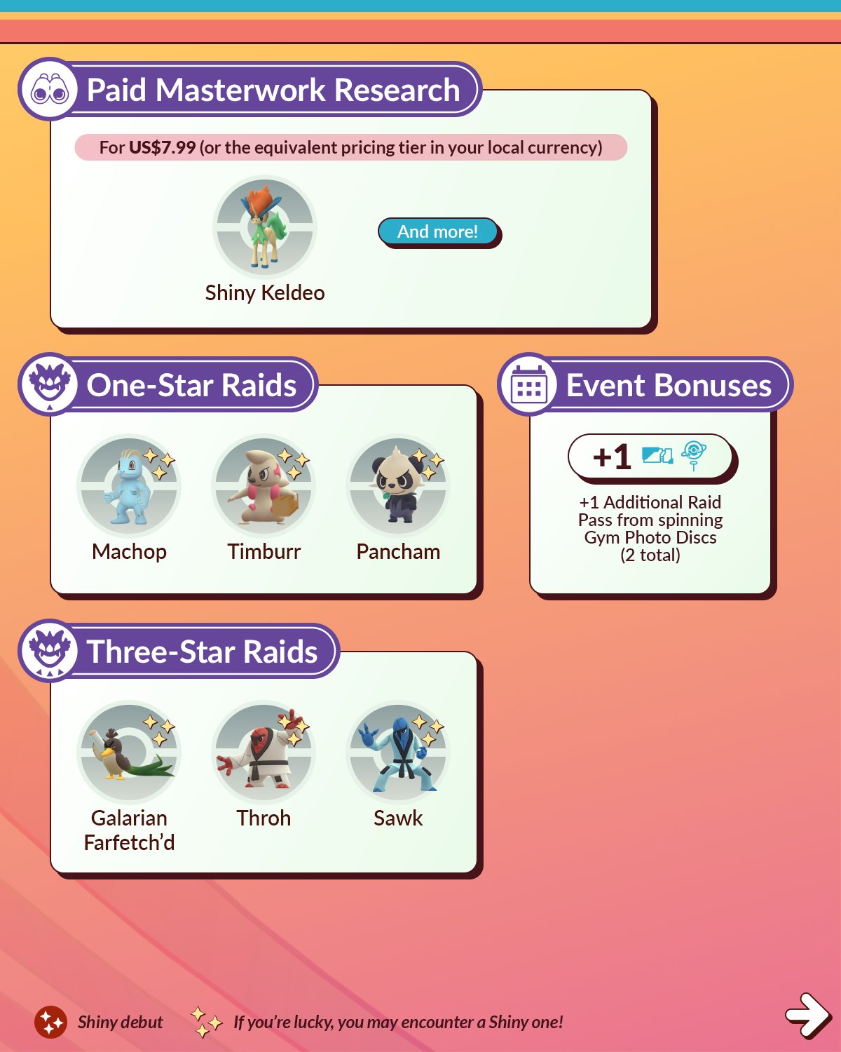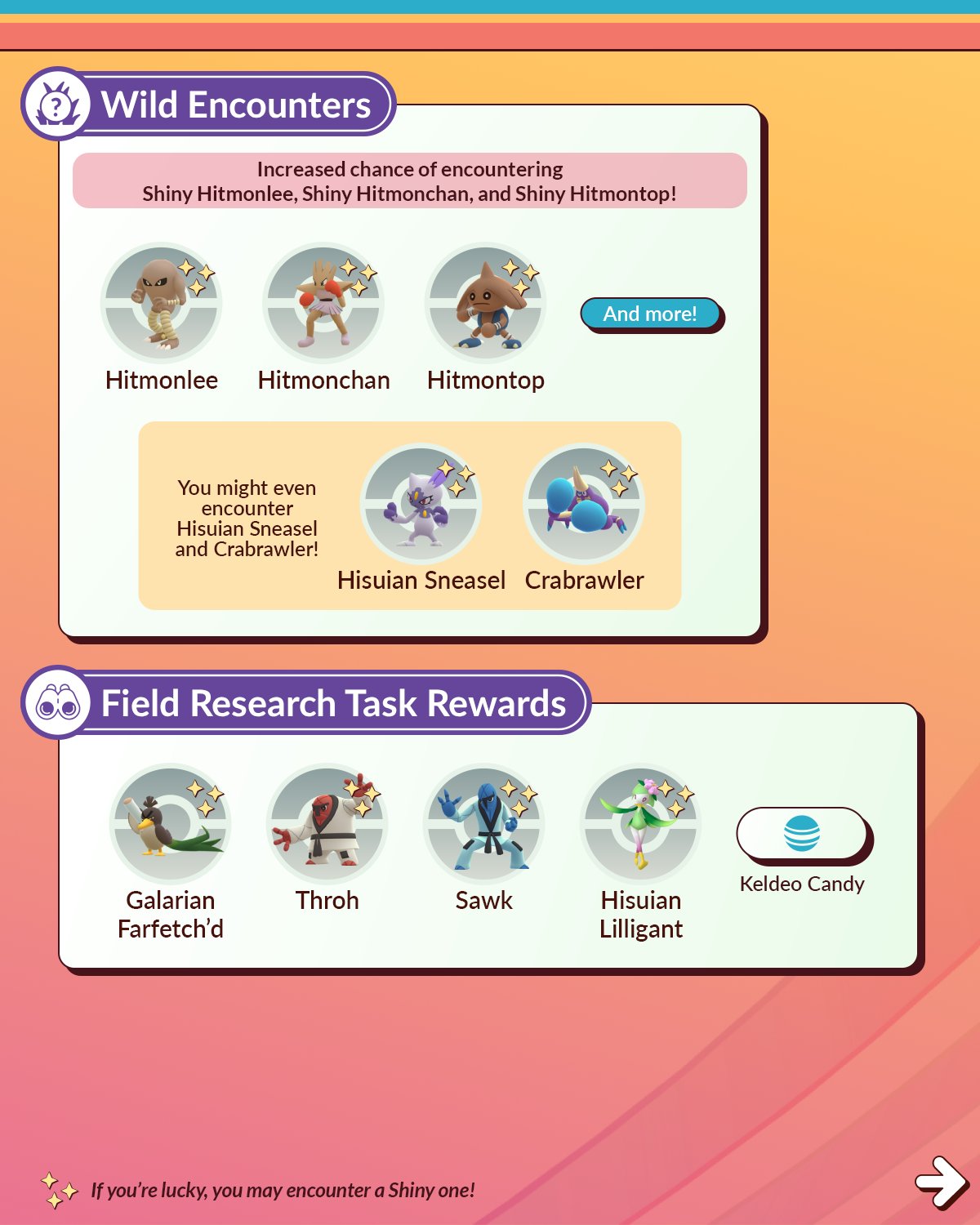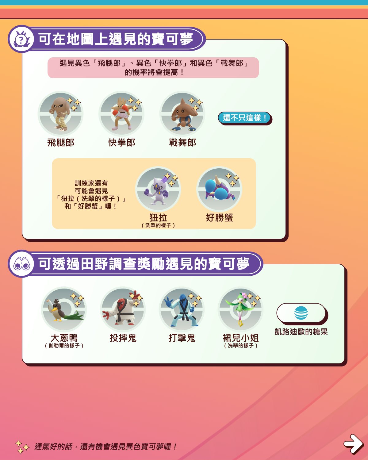 訓練家將有機會在地圖上遇見「飛腿郎」 *、「快拳郎」 *與「戰舞郎」 *等活動主題寶可夢!訓練家甚至還有機會遇見「狃拉(洗翠的樣子)」 *與「好勝蟹」 *喔!