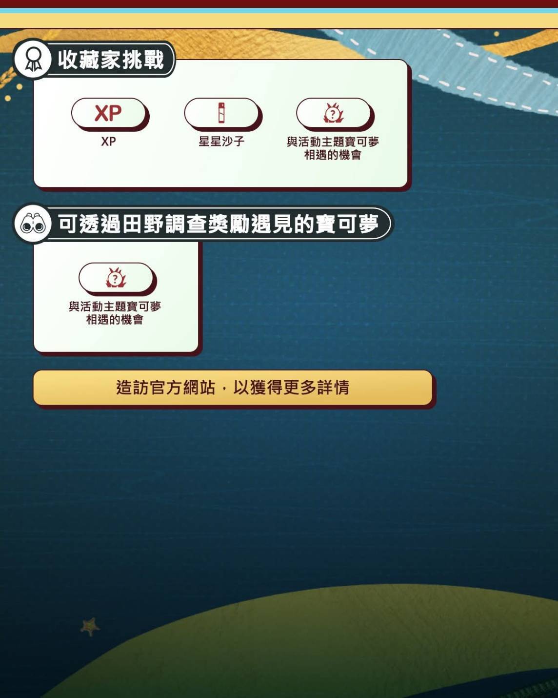 只要完成本次以「捕捉寶可夢」為主題的收藏家挑戰,就可以獲得經驗、星塵以及與活動主題寶可夢相遇的機會。