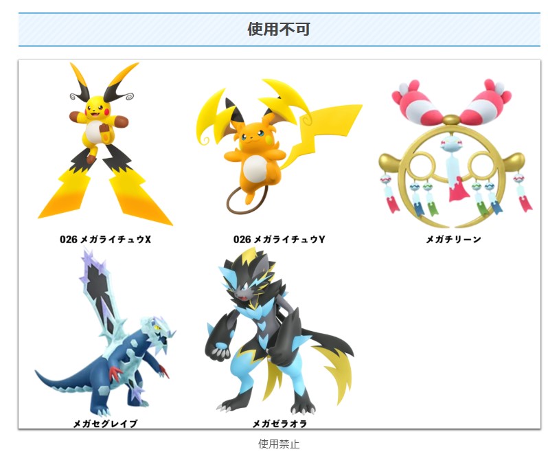 禁止使用:追加 DLC「超次元爆湧(M次元ラッシュ)」中新登場的超級進化寶可夢無法使用。