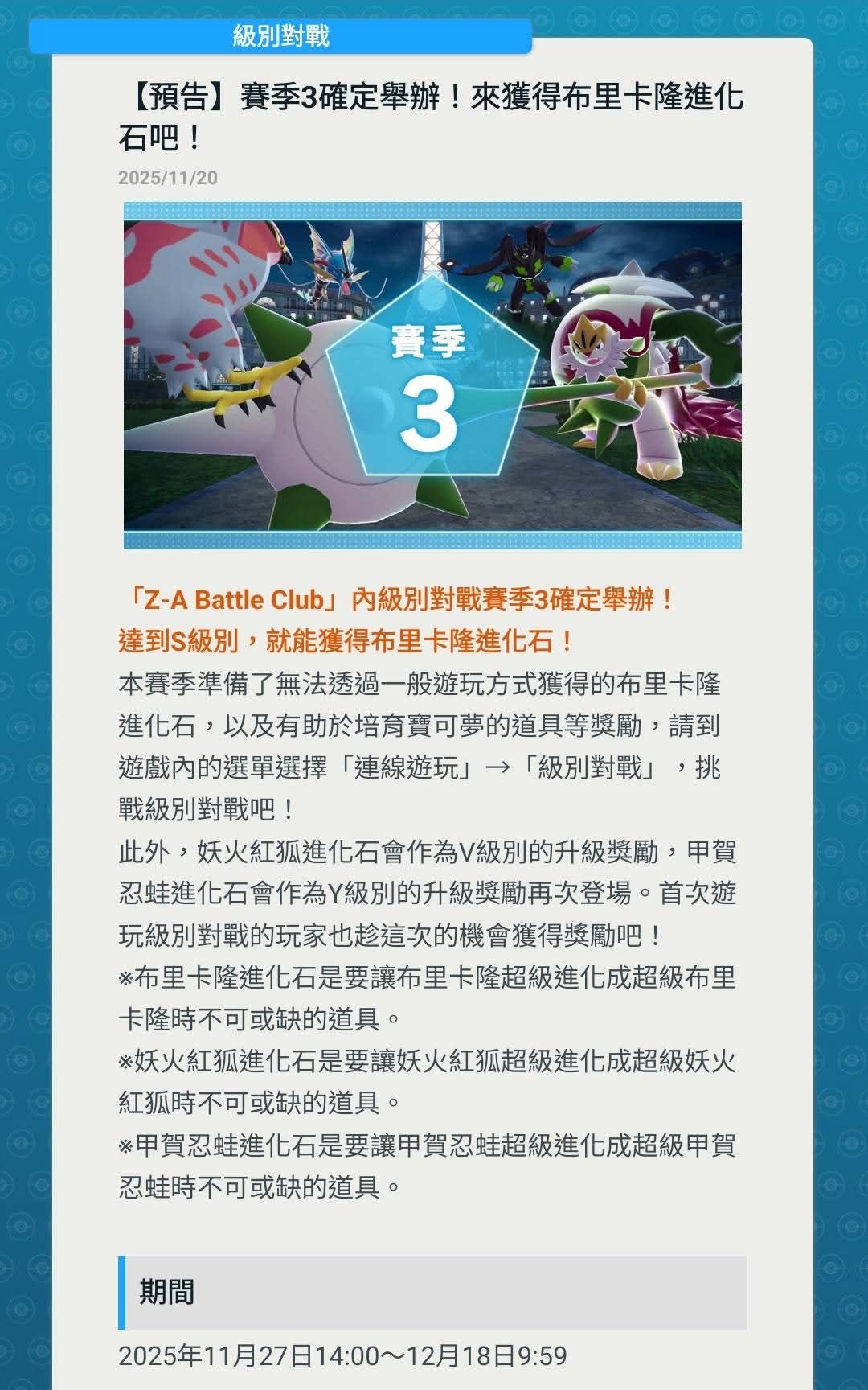 《寶可夢傳說 Z-A》(Pokémon LEGENDS Z-A)級別對戰 Season 3 的規則與獎勵資訊。
