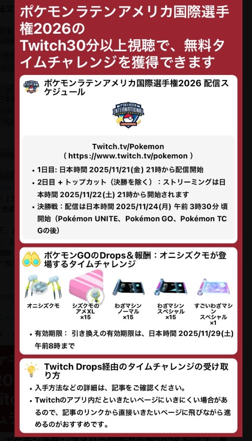 ポケモンラテンアメリカ国際選手権2026のTwitch30分以上視聴で、無料タイムチャレンジを獲得できます。