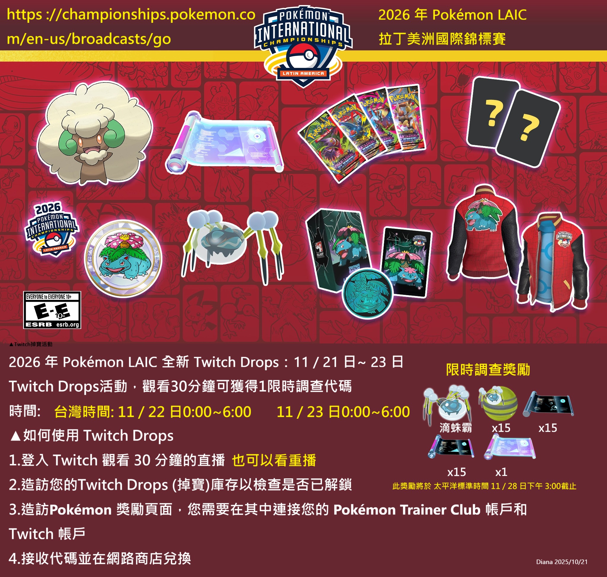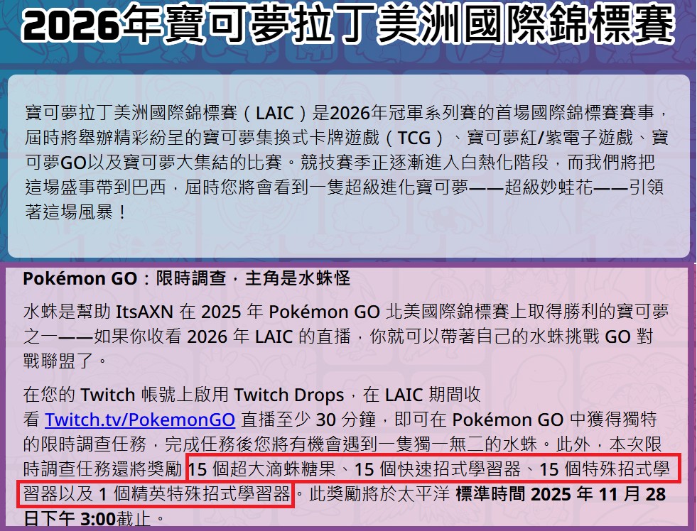 11/22 直播拿序號代碼 Pokémon LAIC 拉丁美洲國際錦標賽 Pokemon GO 2025 Twitch 冠軍賽獎勵限時調查任務2關卡