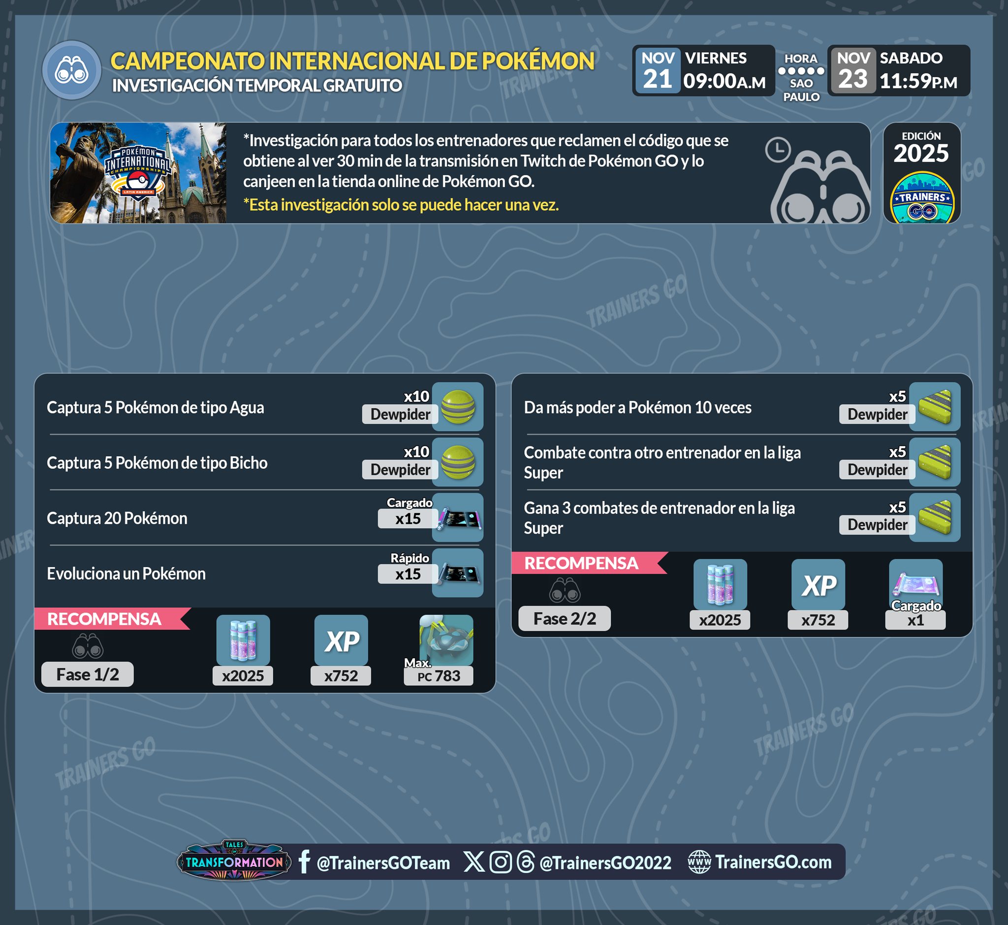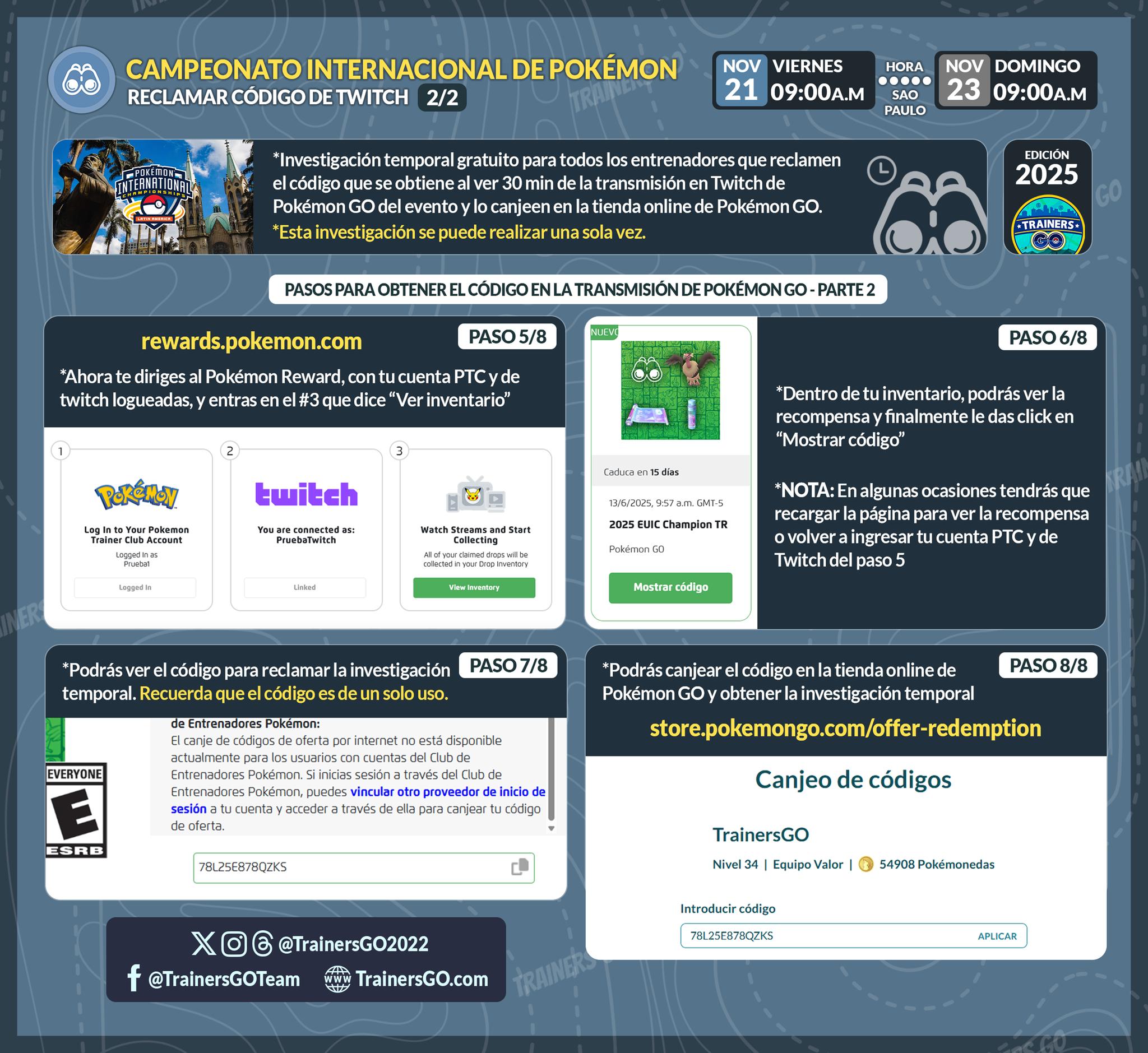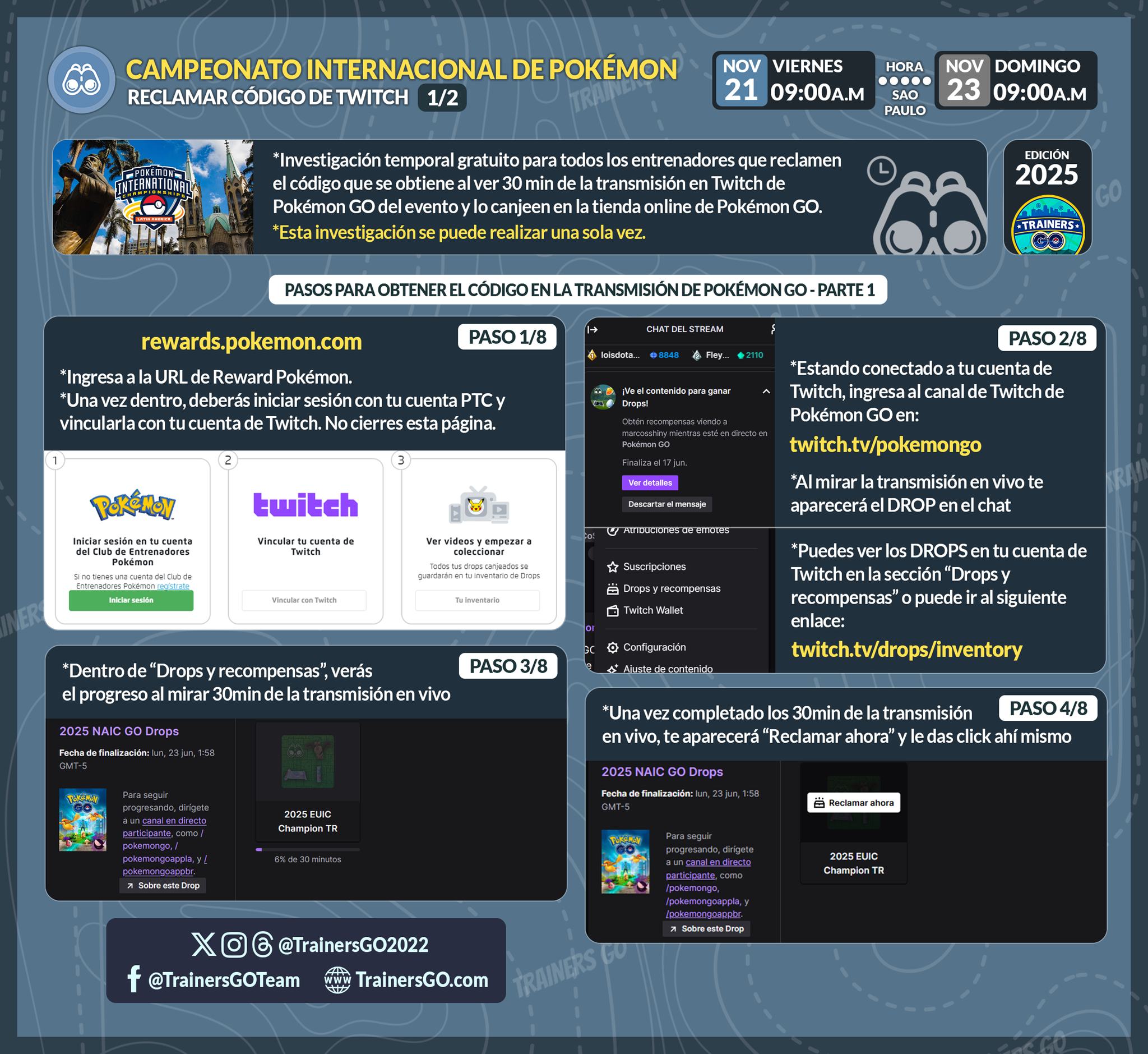 🧐 Trainers, al mirar 30 minutos de la transmisión del Campeonato Internacional Pokémon de Latinoamérica (LAIC) en el Twitch de Pokémon GO, podrás obtener un código para reclamar una Investigación temporal en Pokémon GO.