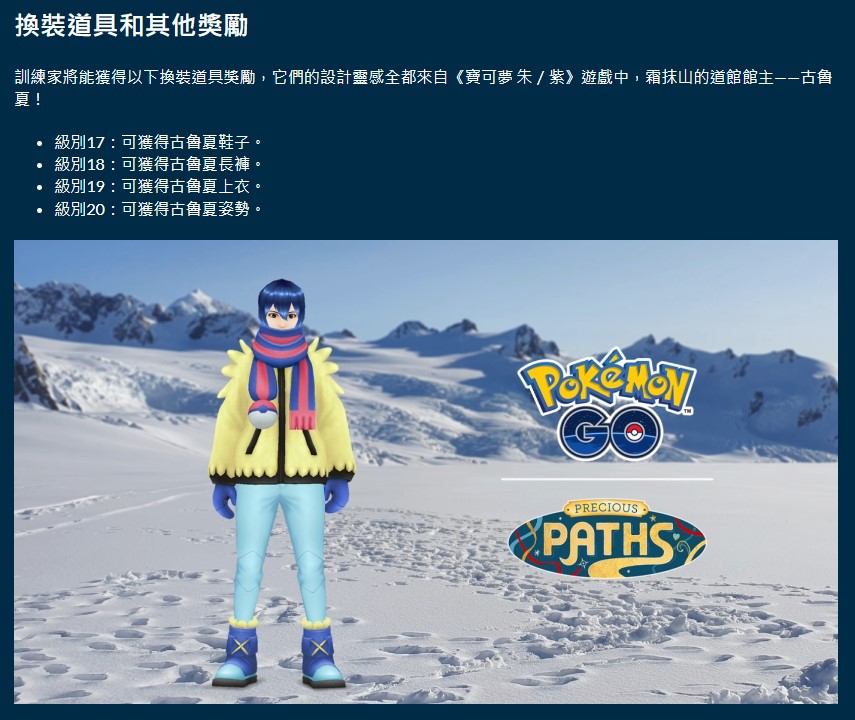 訓練家將能獲得以下換裝道具獎勵,它們的設計靈感全都來自《寶可夢 朱/紫》遊戲中,霜抹山的道館館主——古魯夏!
