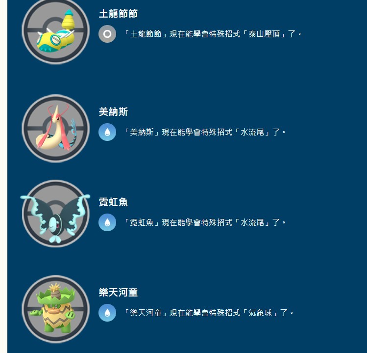 美納斯 (Milotic) & 霓虹魚 (Lumineon):學會特殊招式「水流尾 (Aqua Tail)」。