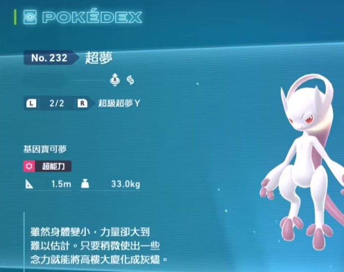 ■超級超夢Y 分類:基因寶可夢 屬性:超能力 身高:1.5m 體重:33.0kg
