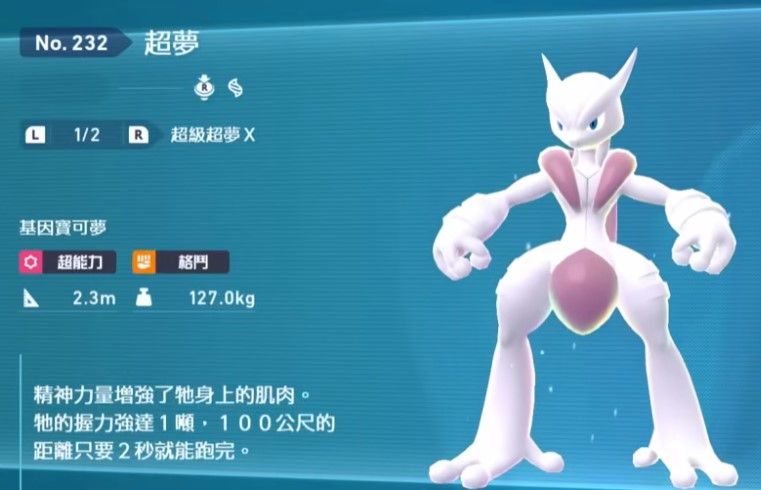 ■超級超夢X 分類:基因寶可夢 屬性:超能力/格鬥 身高:2.3m 體重:127.0kg