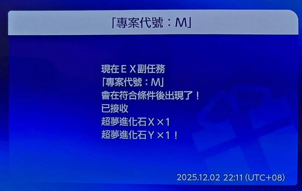 12月2日起,「超夢進化石X」和「超夢進化石Y」將透過《寶可夢傳說 Z-A》及《寶可夢傳說 Z-A Nintendo Switch 2 Edition》的「神秘禮物」發佈,EX副任務「專案代號:M」也將可以開始遊玩。