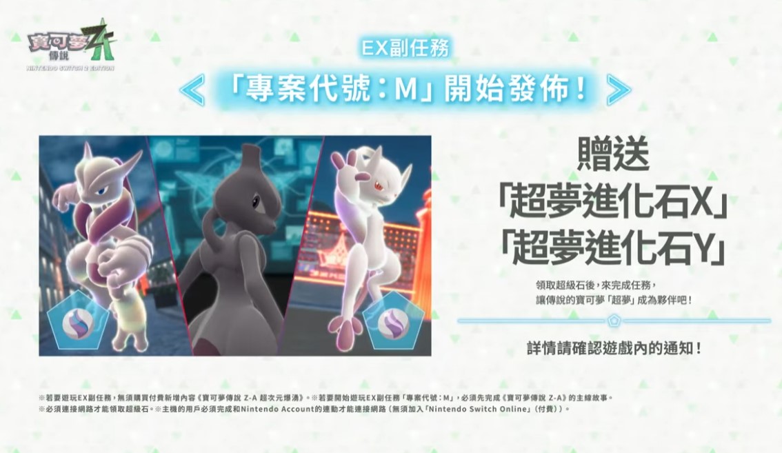 ※EX副任務「專案代號:M」可於《寶可夢傳說 Z-A》或《寶可夢傳說 Z-A Nintendo Switch 2 Edition》內遊玩。