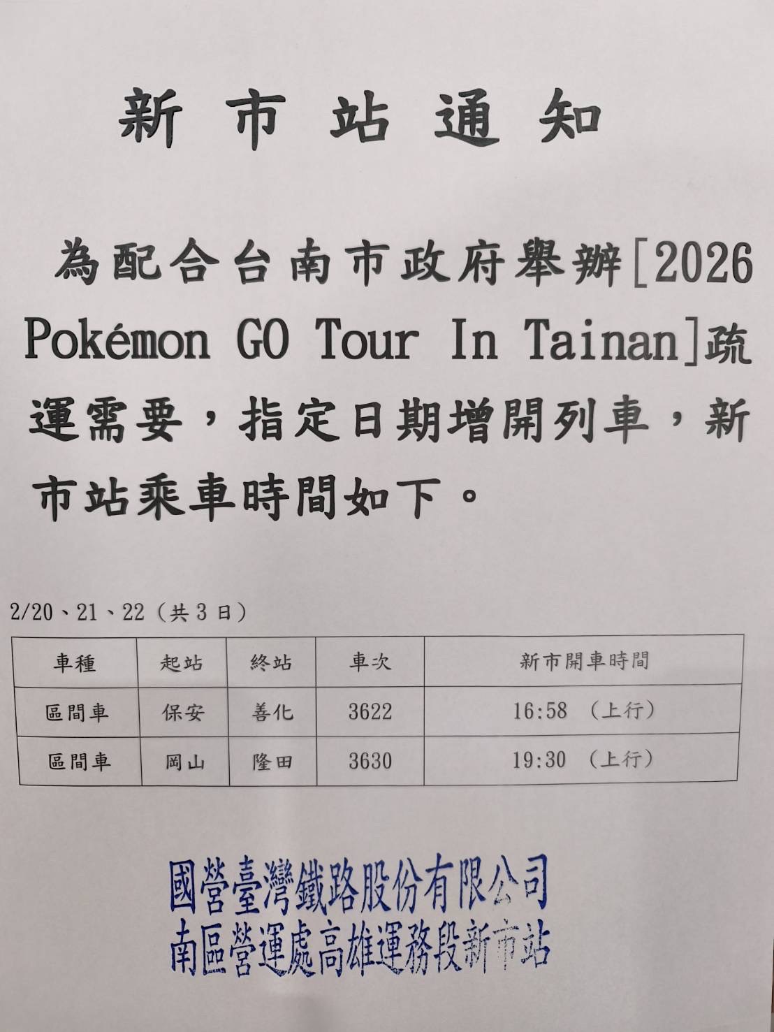 內文: 為配合台南市政府舉辦 [2026 Pokémon GO Tour In Tainan] 疏運需要,指定日期增開列車,新市站乘車時間如下。