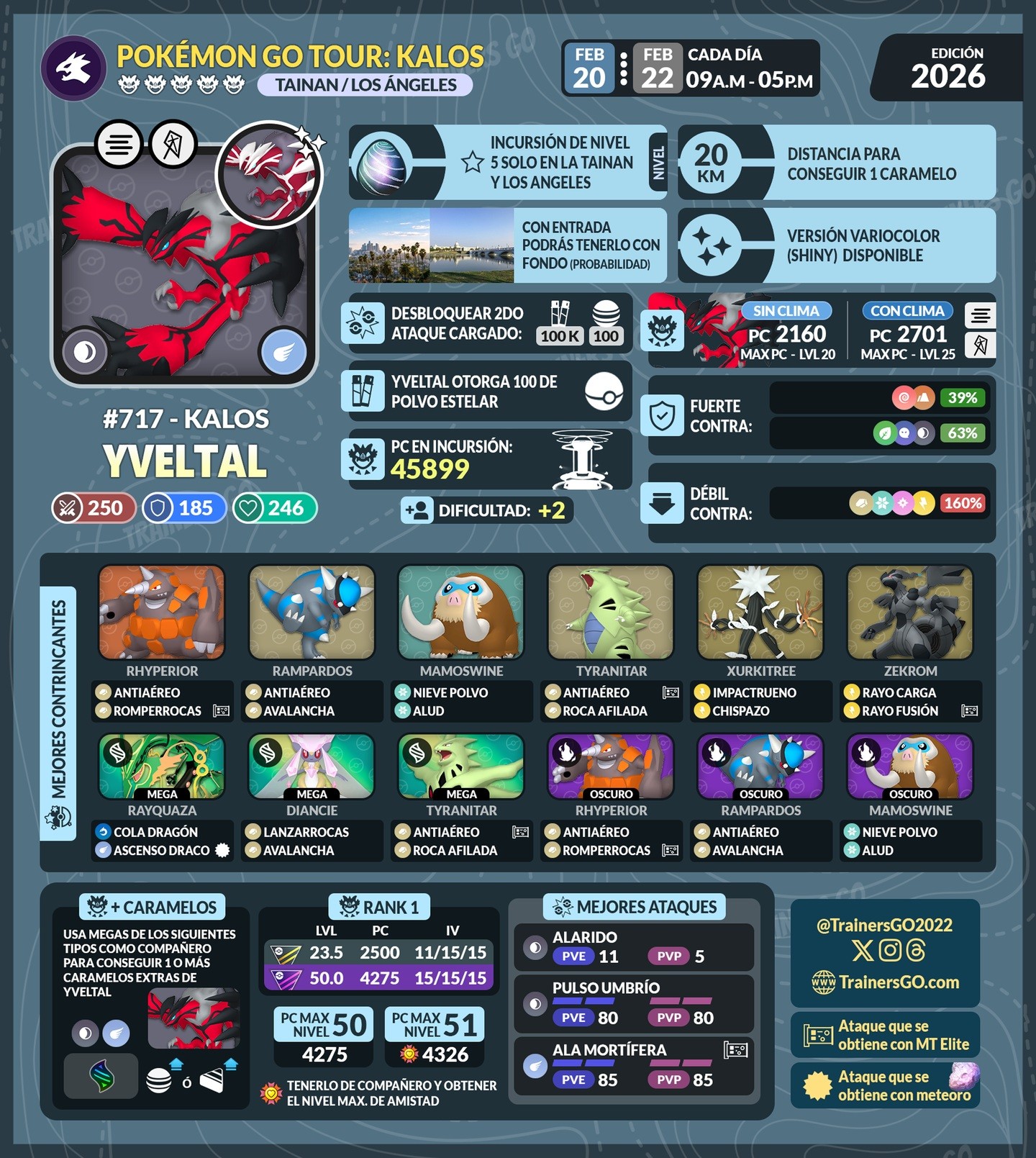 伊裴爾塔爾 (Yveltal) ✨ 天氣加成:CP 2591 – 2701 一般等級 (L20):CP 2073 – 2160