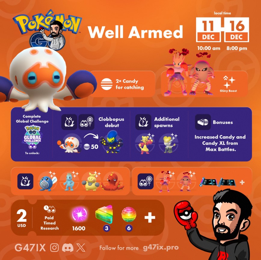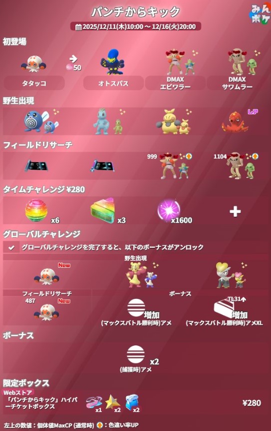 12/11 拳腿並擊活動、田野調查獎勵、付費解鎖限時調查、全球大挑戰、拳拳蛸、八爪武師 Pokemon GO 2025