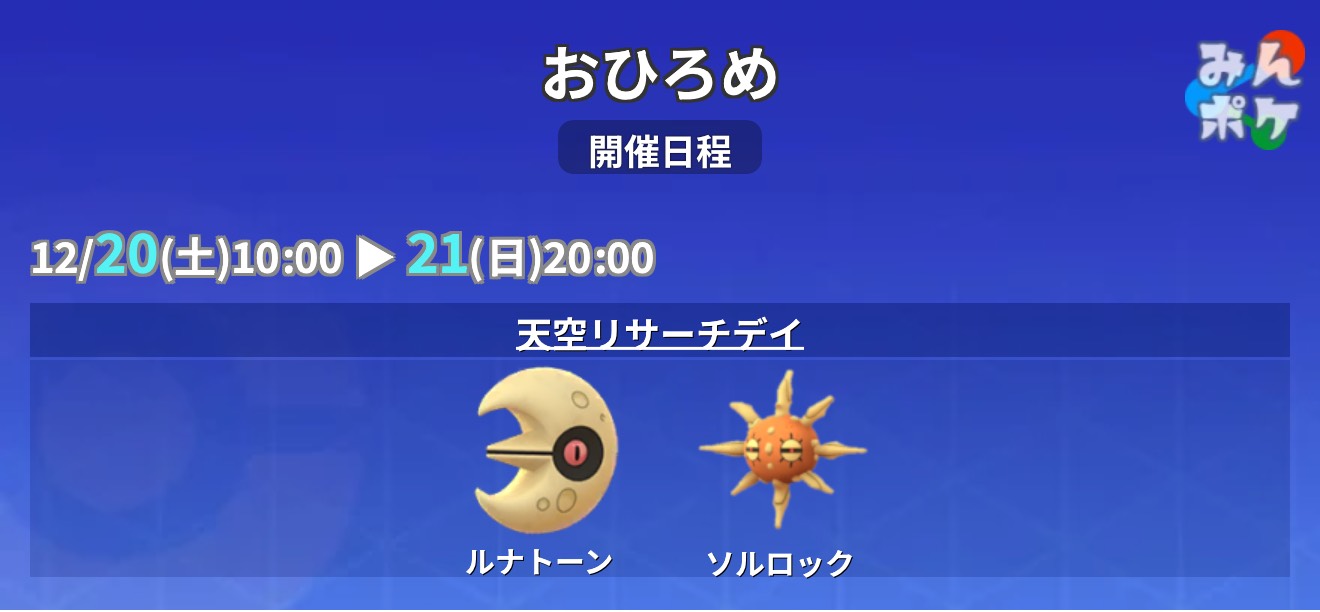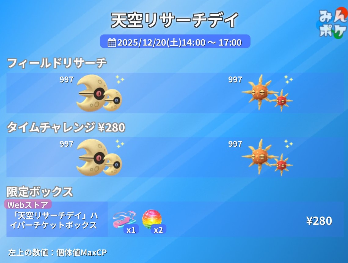 活動時間: 2025.12.20 (14:00-17:00) 轉動寶可補給站即可獲得以下活動限定課題,獎勵皆有機會遇見 月石 或 太陽岩(皆有色違機會)。