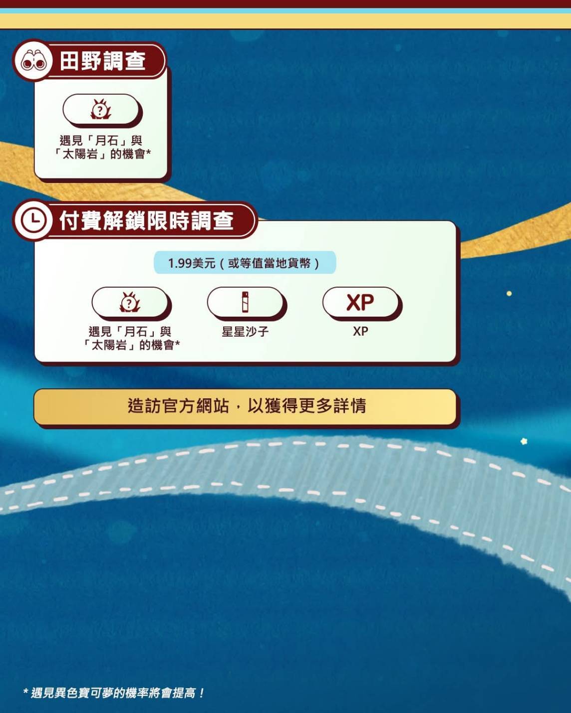 * 本次限時調查出現異色寶可夢的機率,與活動期間在田野調查出現異色寶可夢的機率相同喔!