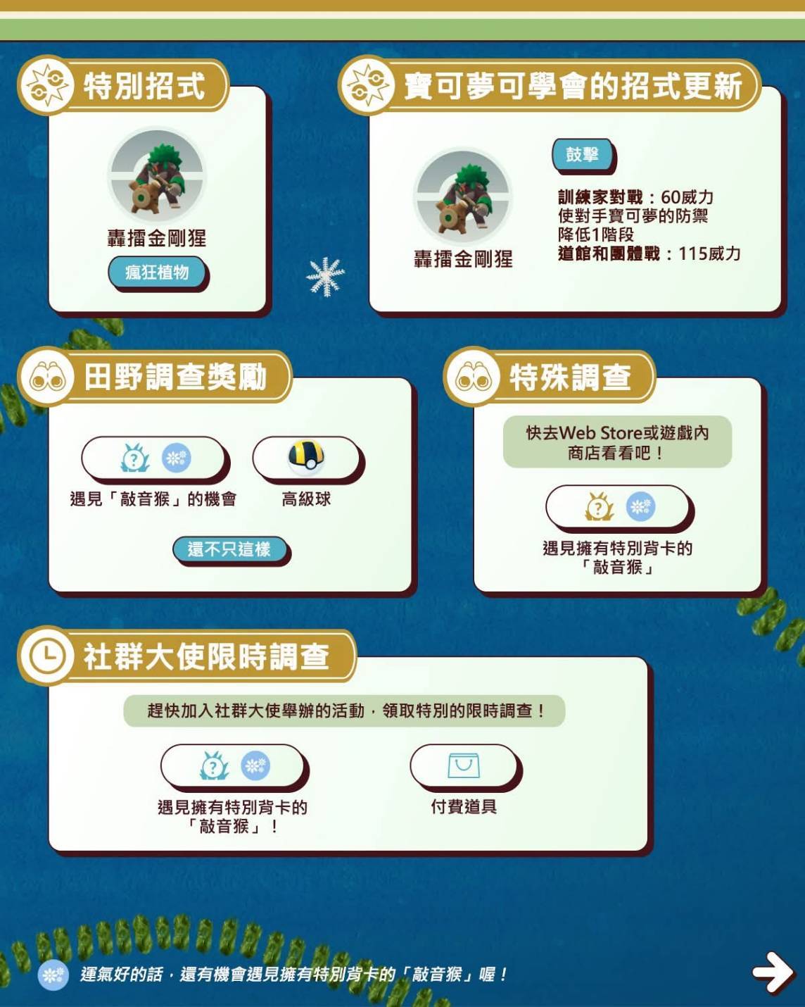 限時調查 (社群大使舉辦的活動): 社群日活動中登入遊戲,即可解鎖限時調查,完成後可遇見擁有特別背卡的敲音猴