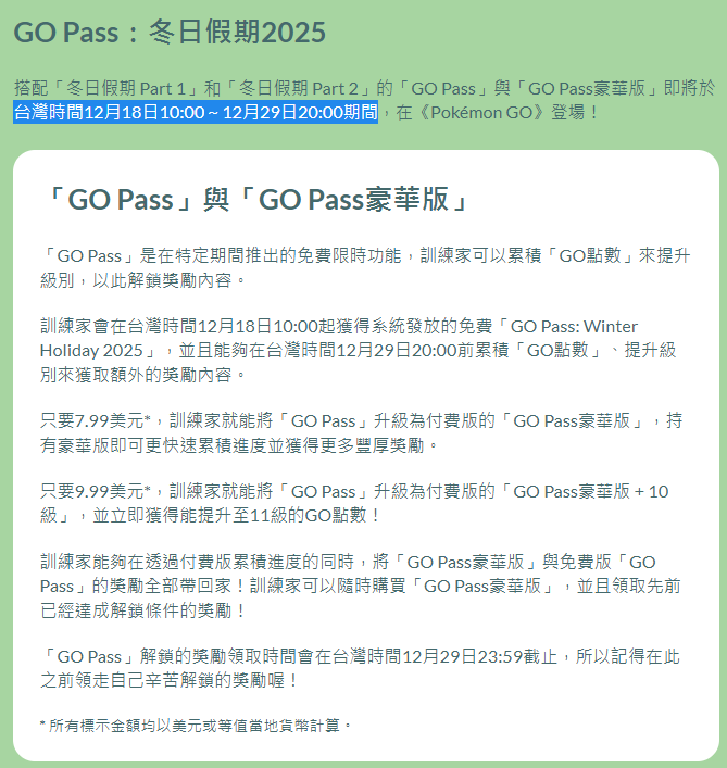 訓練家會在台灣時間12月18日10:00起獲得系統發放的免費「GO Pass: Winter Holiday 2025」,並且能夠在台灣時間12月29日20:00前累積「GO點數」、提升級別來獲取額外的獎勵內容。