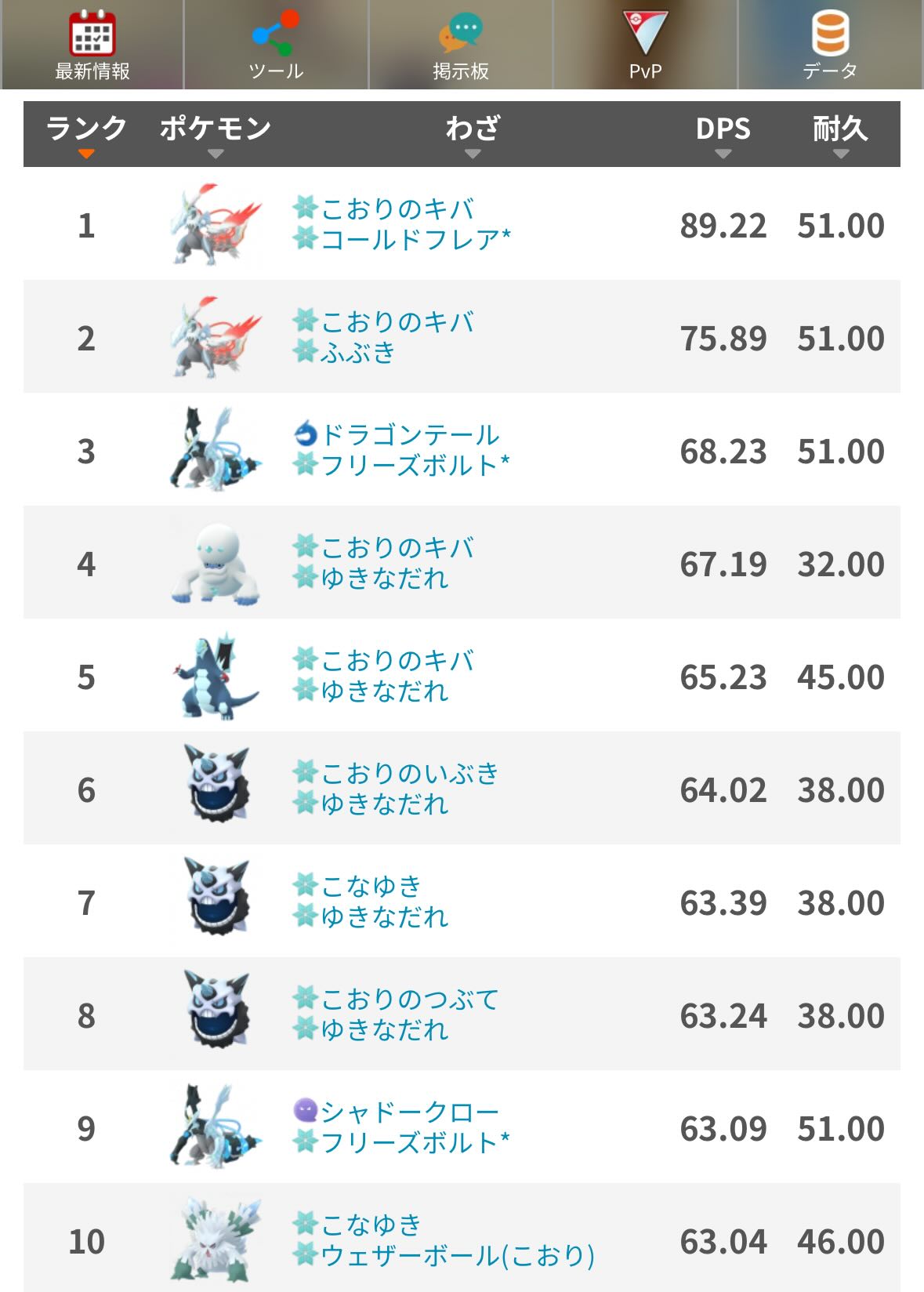 團體戰 (PvE) 排名 & 招式:龍系 #21:龍息 + 龍之波動 冰系 #1:冰凍牙 + 極寒冷焰* 超級聯盟 (Great League): X (不適用)