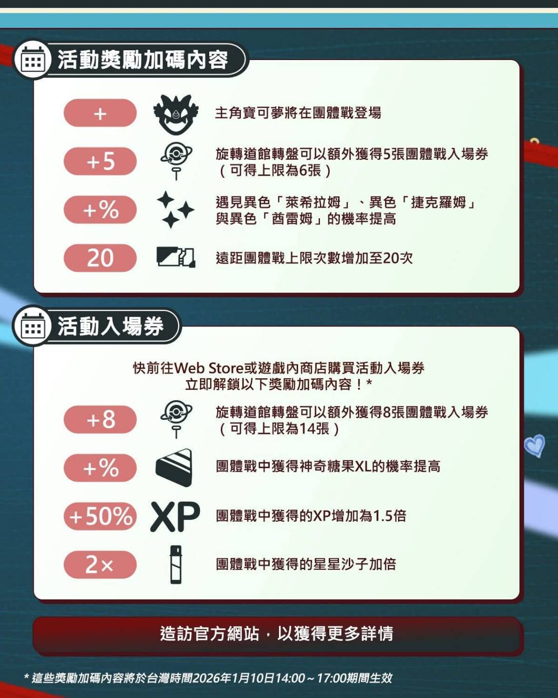 這些獎勵加碼內容將於台灣時間2026年1月10日14:00~17:00期間生效。