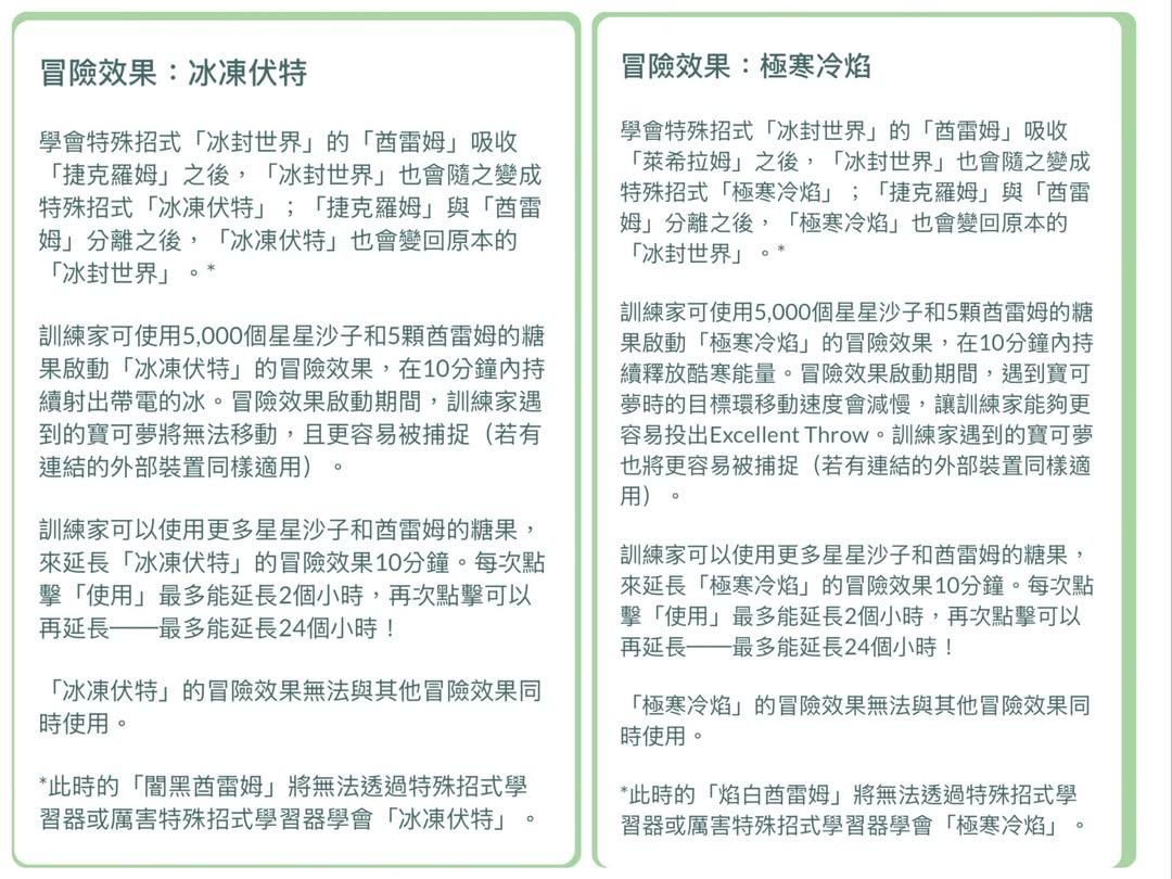 訓練家可以使用更多星星沙子和酋雷姆的糖果,來延長「極寒冷焰」的冒險效果10分鐘。