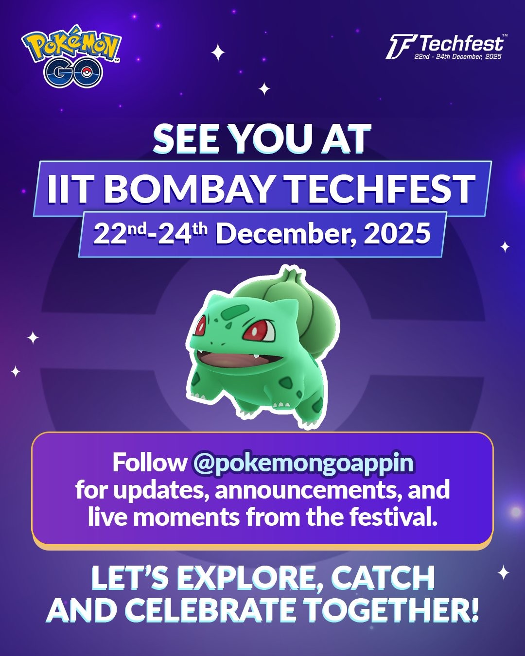Trainers,Pokémon GO will be coming to the IIT-Bombay for Techfest 2025 from December 22–24, 2025.