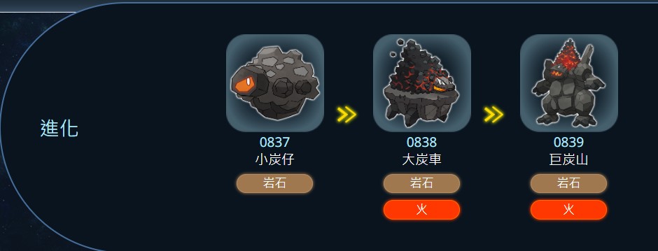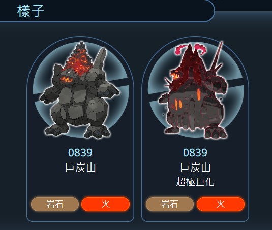 | 超極巨化巨炭山 | 超極巨化 | 如前所述,它是目前的最強岩石坦克,適合在面對冰、火屬性 Boss 時擔任首發,為後續輸出手爭取累積能量的時間。 |