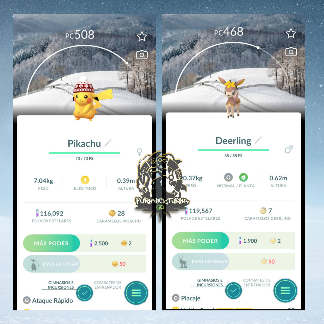 🔹 5,000 PX🔹 2,500 Polvos Estelares🔹 Huevo Suerte🔹 Encuentros con Pikachu con gorro de invierno✨ y Deerling (Forma Invierno)✨, ambos con fondo de locación. 🦇✨