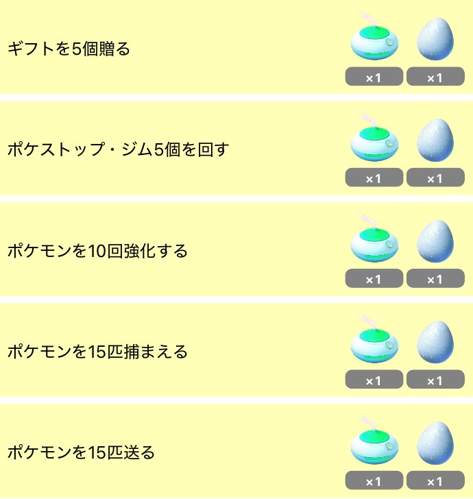 ポケストップ・ジム5個を回す 旋轉 5 個補給站或道館轉盤 薰香 x1 或 幸運蛋 x1