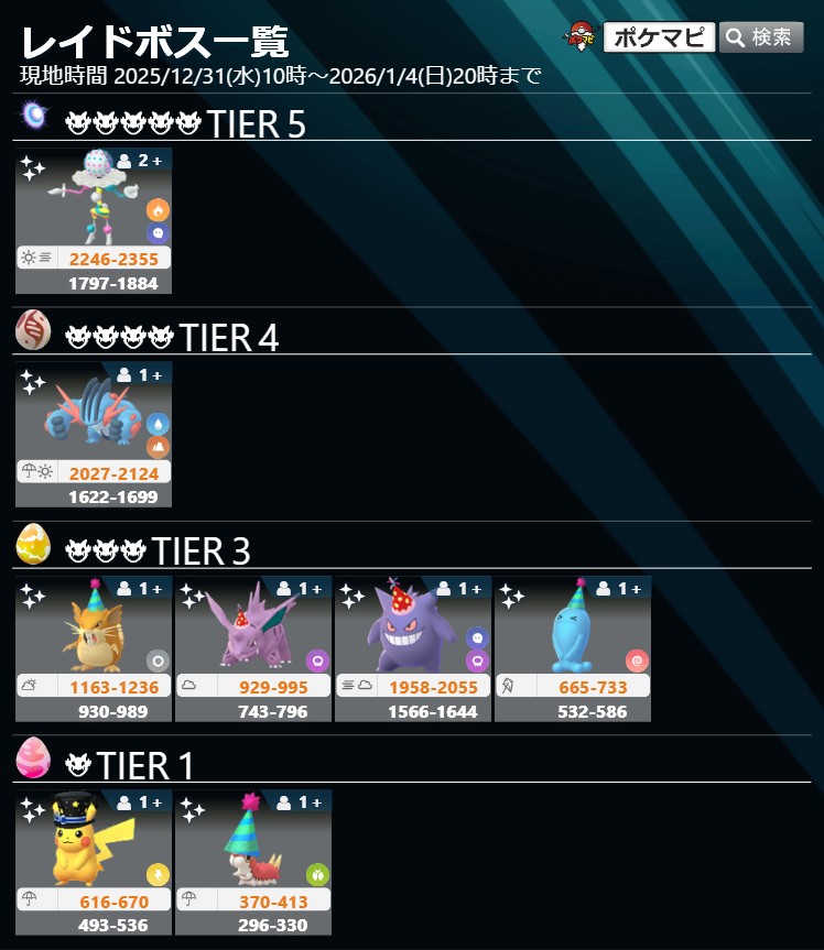 2025/12/31-2026/01/04 更新 BOSS 最新GO團體戰頭目CP表更新 1星-6星 頭目一覽 (Raid Boss List)