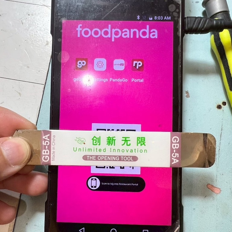 Android 系統: 操作介面像手機一樣,商家透過觸控螢幕操作 foodpanda 的接單 App(goDroid)。