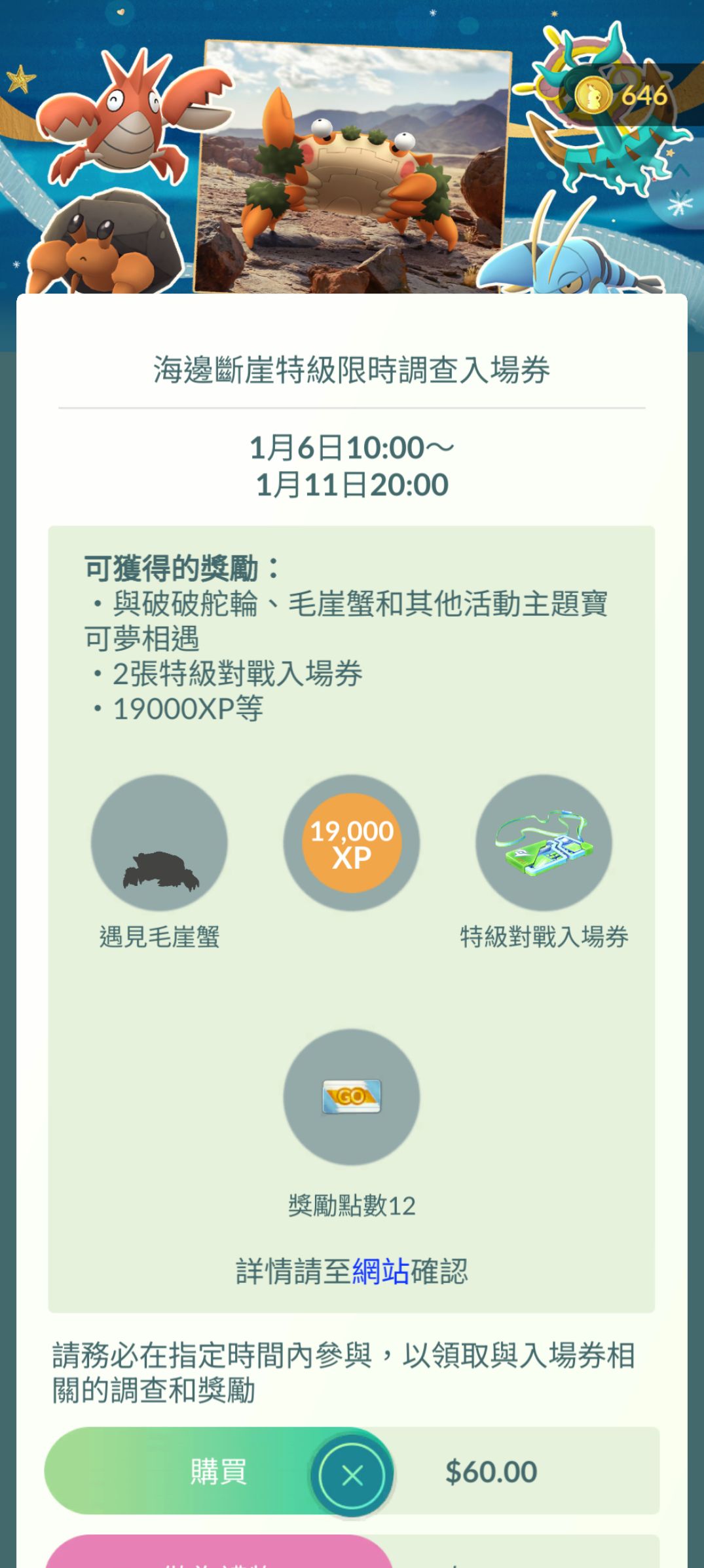 任務:贏得一場團體戰 獎勵(隨機遭遇):破破舵輪✨ (CP 1264) 或是 毛崖蟹 (CP 1030)