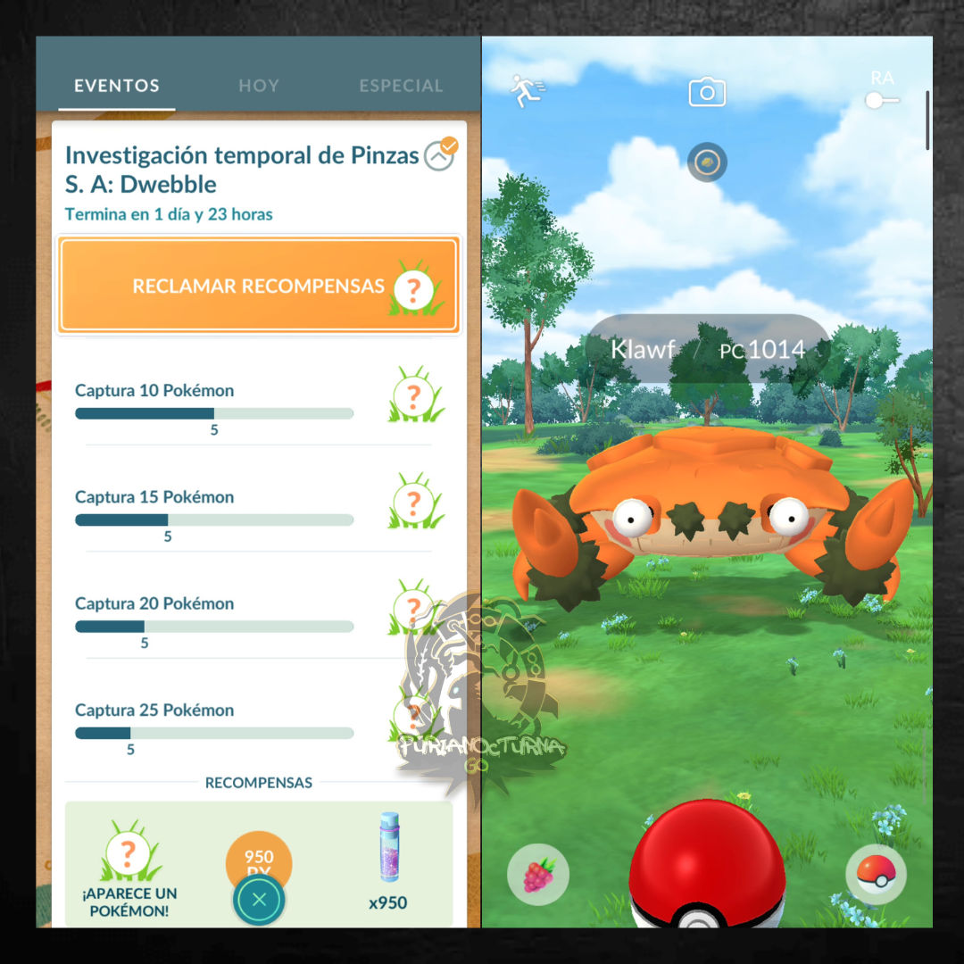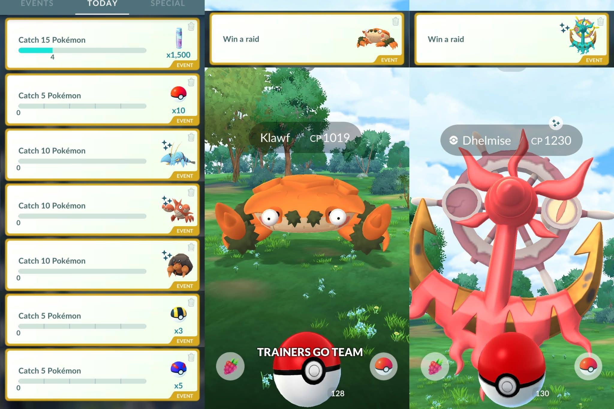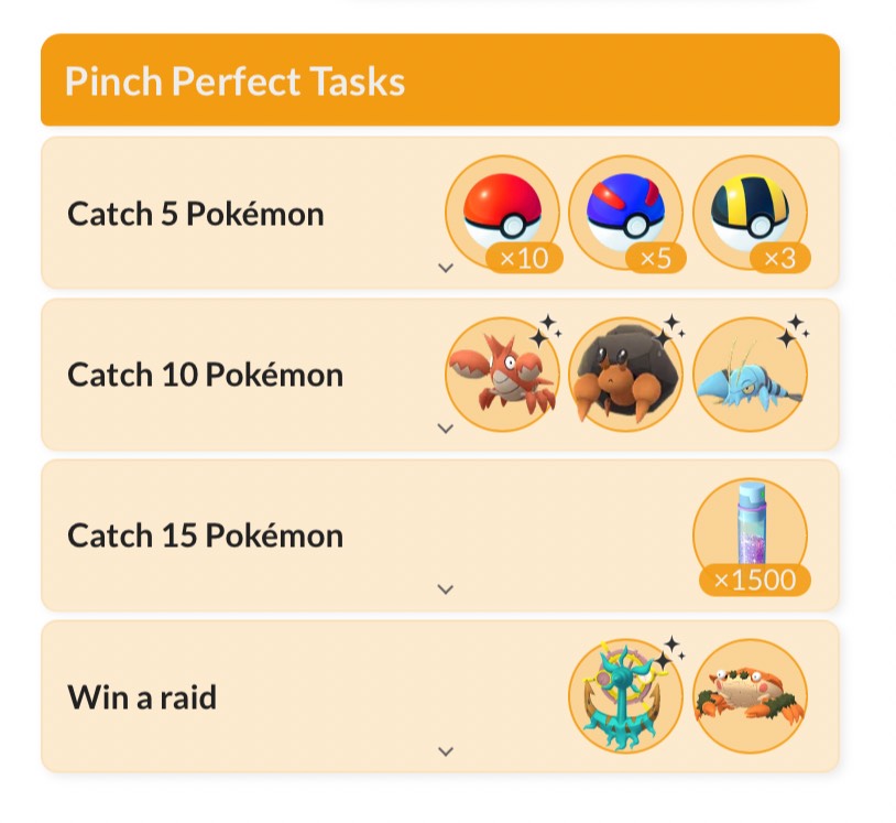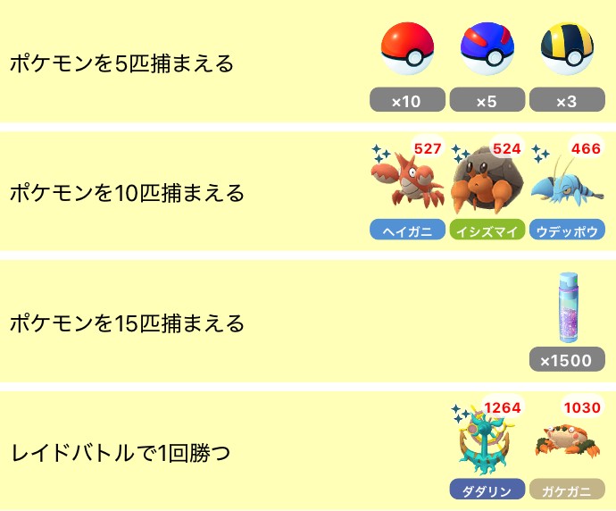 任務:捕捉 10 隻寶可夢 獎勵(隨機遭遇):龍蝦小兵✨、石居蟹✨、或是 鐵臂槍蝦✨